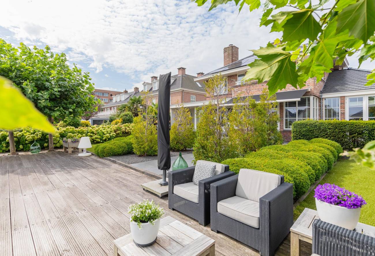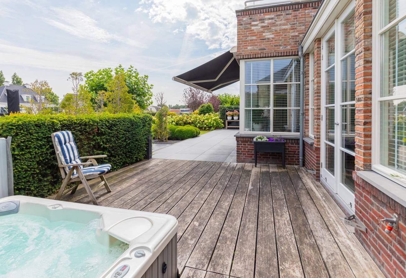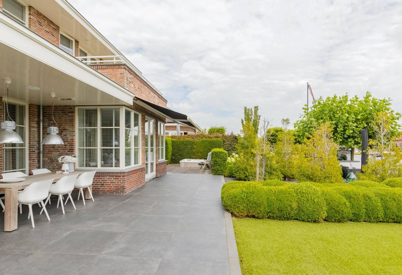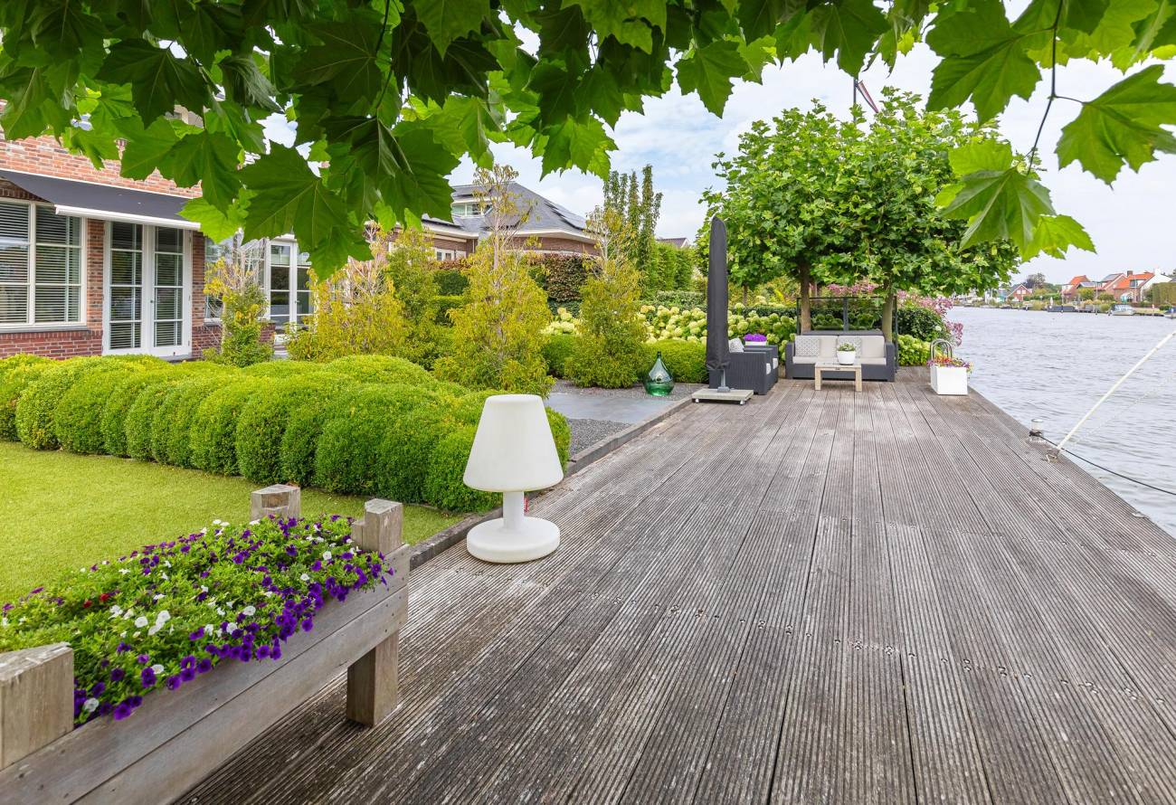 De sfeervolle tuin met terras en verlichting, welke vanuit de living, eetkamer en de Wellness is te betreden, heeft naast een terras rondom ook een fraai houten vlonderterras/aanlegsteiger. Van hier uit heeft u prachtig zicht over het water van de Ringvaart. Het royale achterterras van de villa is betegeld en heeft voldoende privacy. Hier in deze fraai aangelegde tuin zijn er dus genoeg terrassen gecreëerd om heerlijk van de tuin en het uitzicht te genieten.
