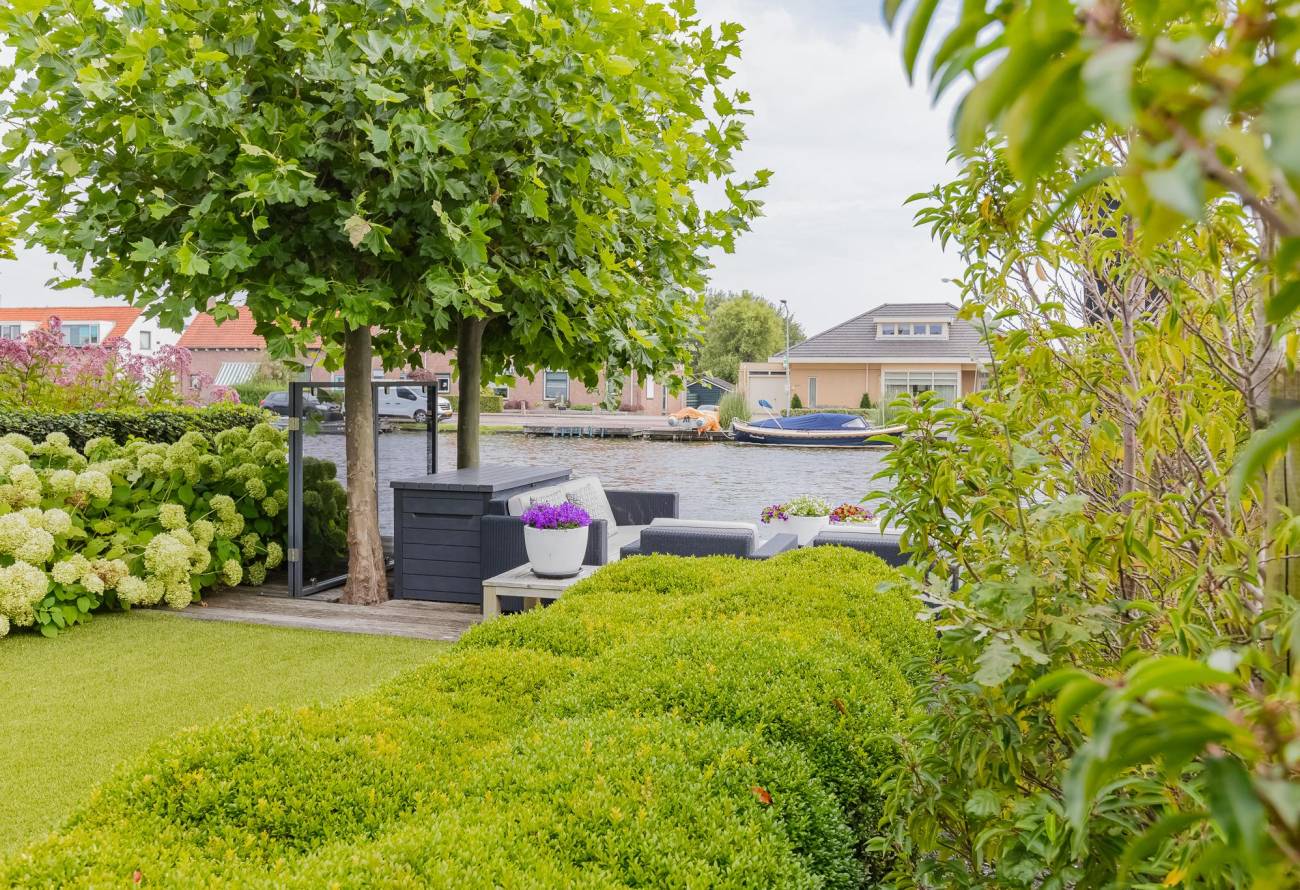 Prachtig aangelegde tuin aan het water met steiger van 20 meter lang om een boot of jacht aan te leggen is verder voorzien van een zwemtrap.