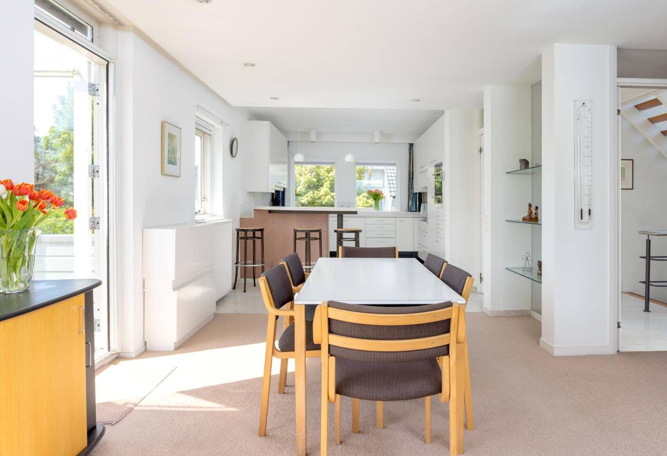 Op de 1e verdieping zijn de keuken, de eetkamer, de woonkamer en de apart gelegen werk- of tv-kamer. De woonkamer biedt fenomenaal uitzicht over de Zijl richting de Kagerplassen, Warmond en Leiderdorp en ook het aan de overkant van de Zijl gelegen natuurlandschap. Vanuit de woon- en eetkamer is er ook toegang tot het dakterras en de tuin.