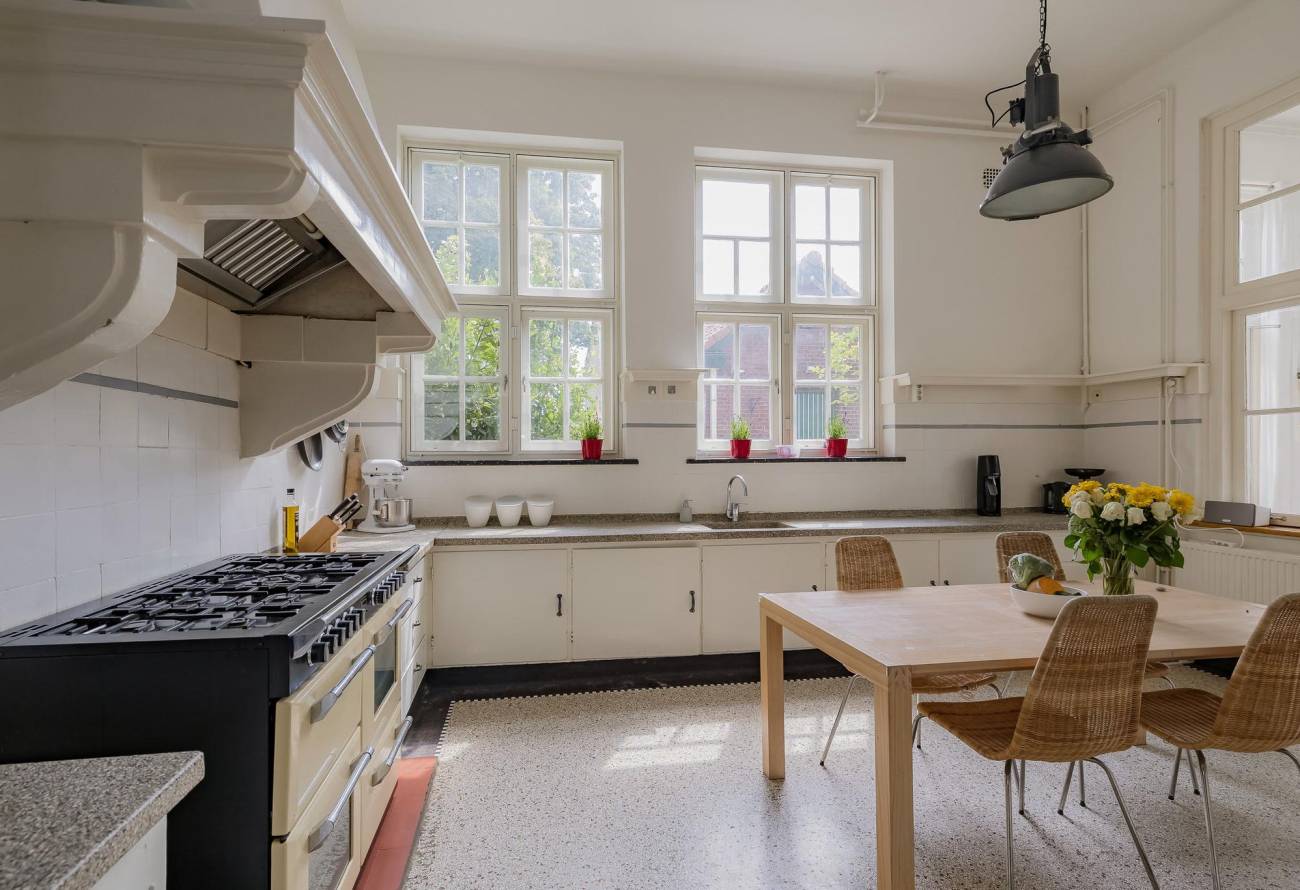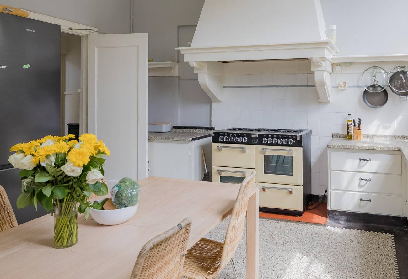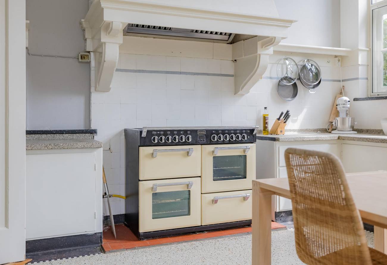 Je komt binnen via de entree en loopt door naar de bijkeuken met aanrechtblad en hotfill-aansluiting. Van daaruit stap je de gezellige leefkeuken in met granitovloer, terrazzo-aanrechtbladen en als pronkstuk een groot 8-pits fornuis met professionele afzuiging.