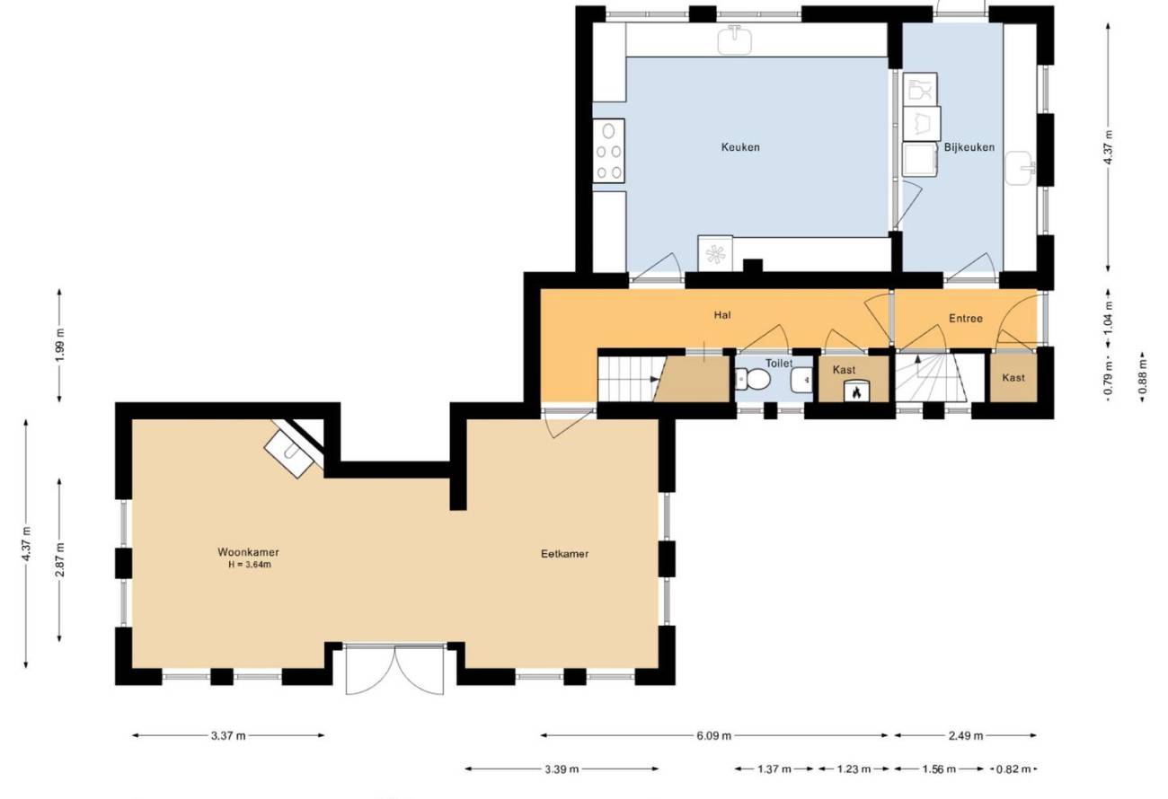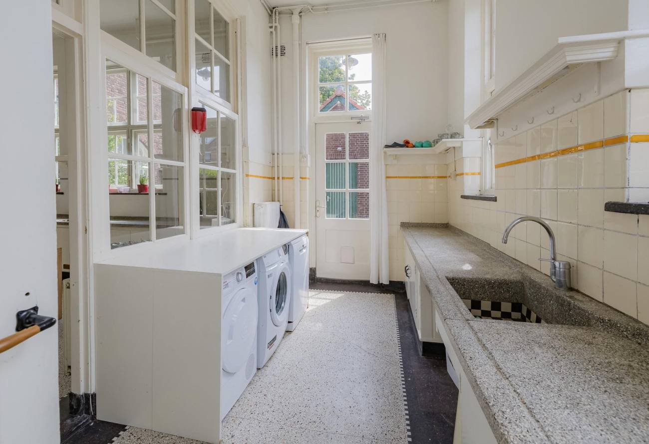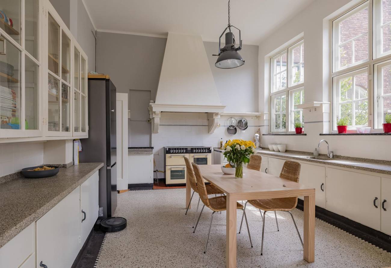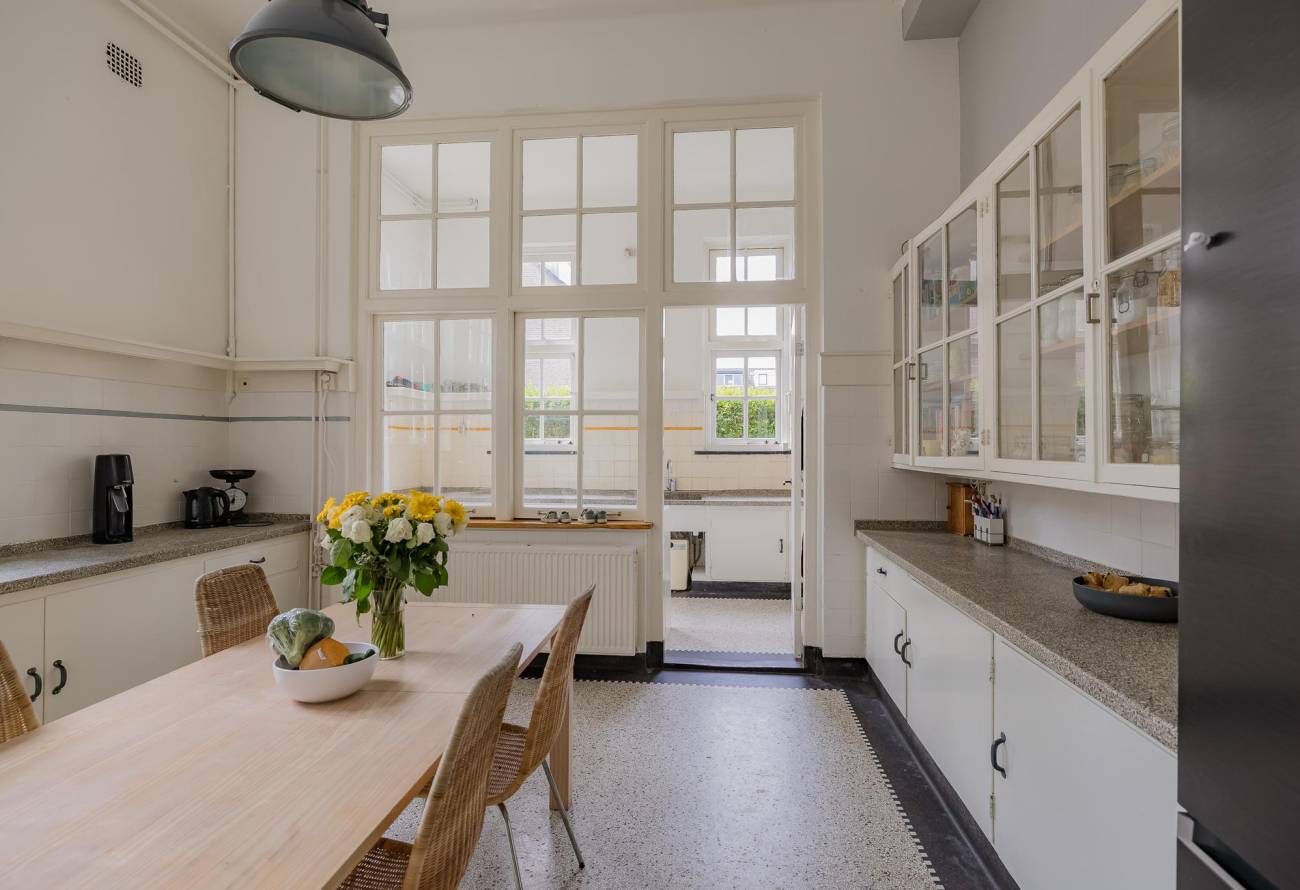 Je komt binnen via de entree en loopt door naar de bijkeuken met aanrechtblad en hotfill-aansluiting. Van daaruit stap je de gezellige leefkeuken in met granitovloer, terrazzo-aanrechtbladen en als pronkstuk een groot 8-pits fornuis met professionele afzuiging.