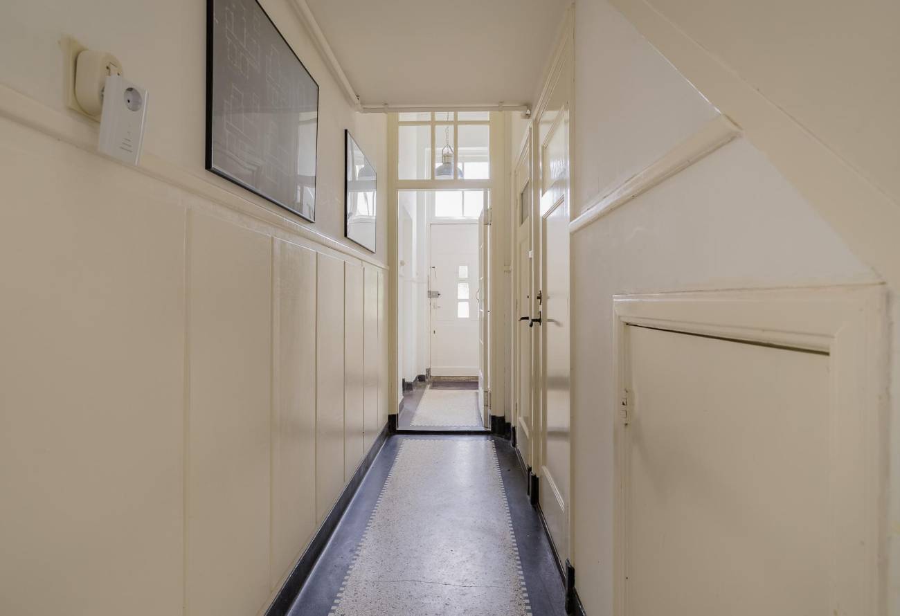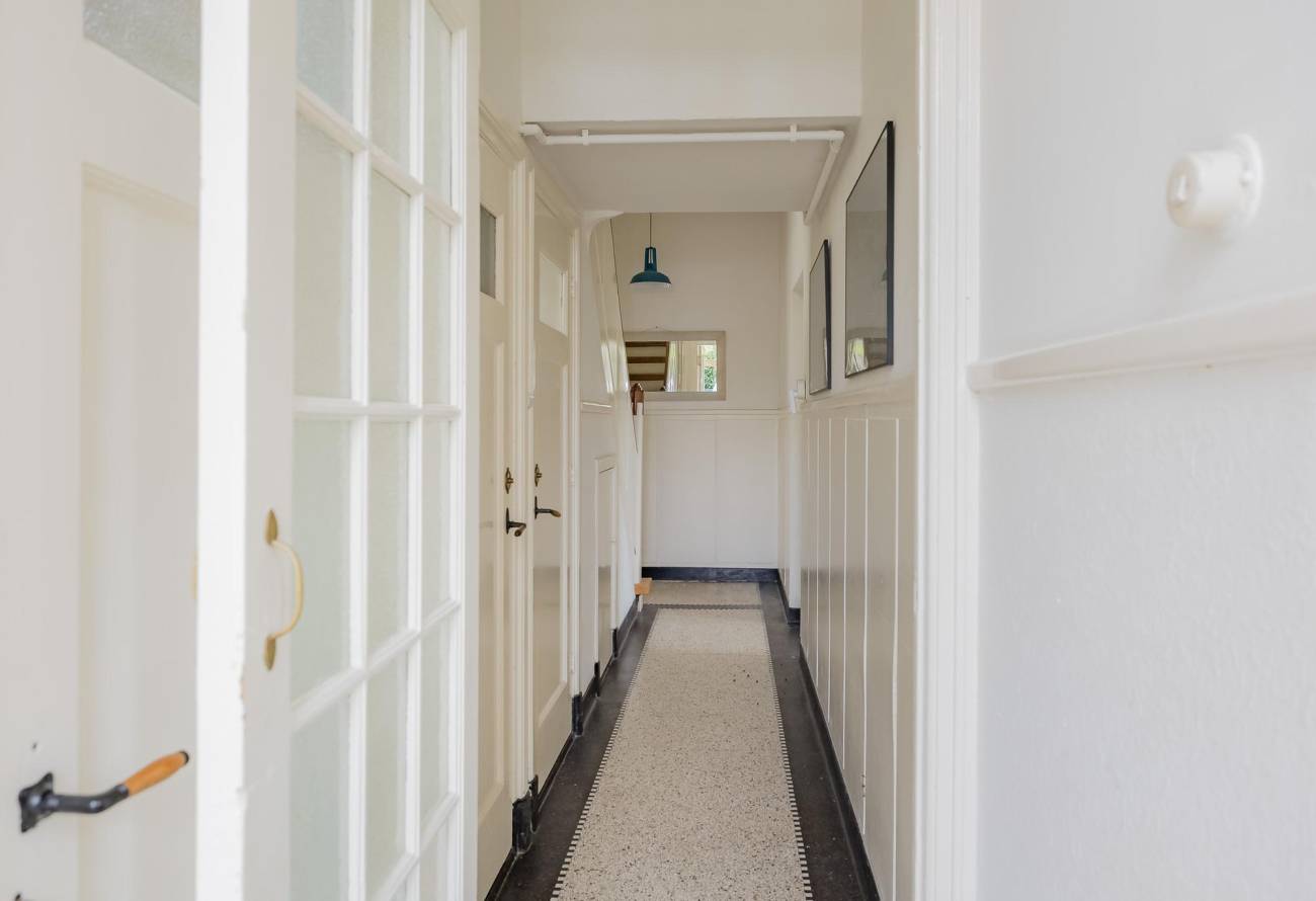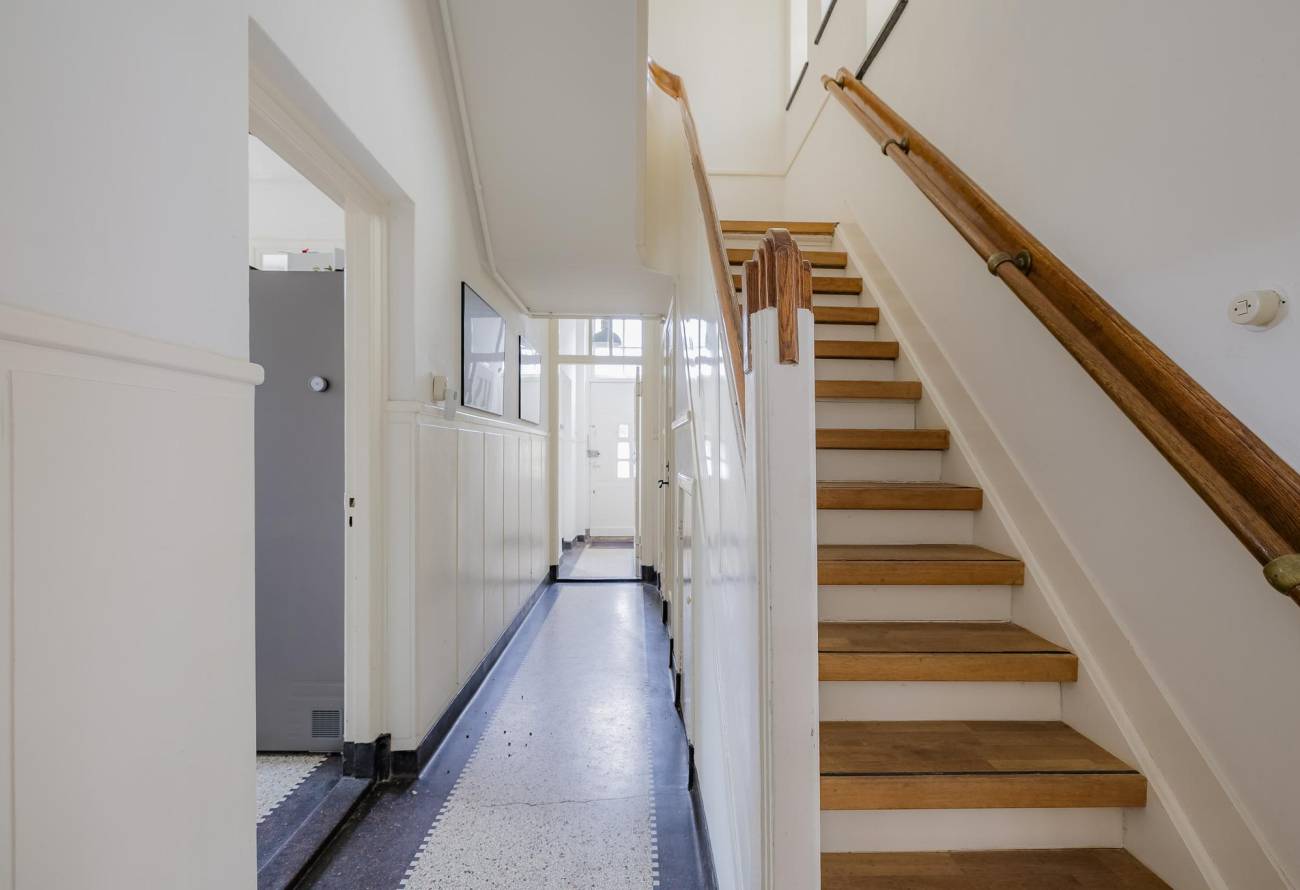Via de vestibule – met een deur naar buiten – bereik je de ruime kelder met stahoogte. In de gang vind je het monumentale trappenhuis in art-decostijl, een toilet, bergkast en de toegang tot de woonkamer.