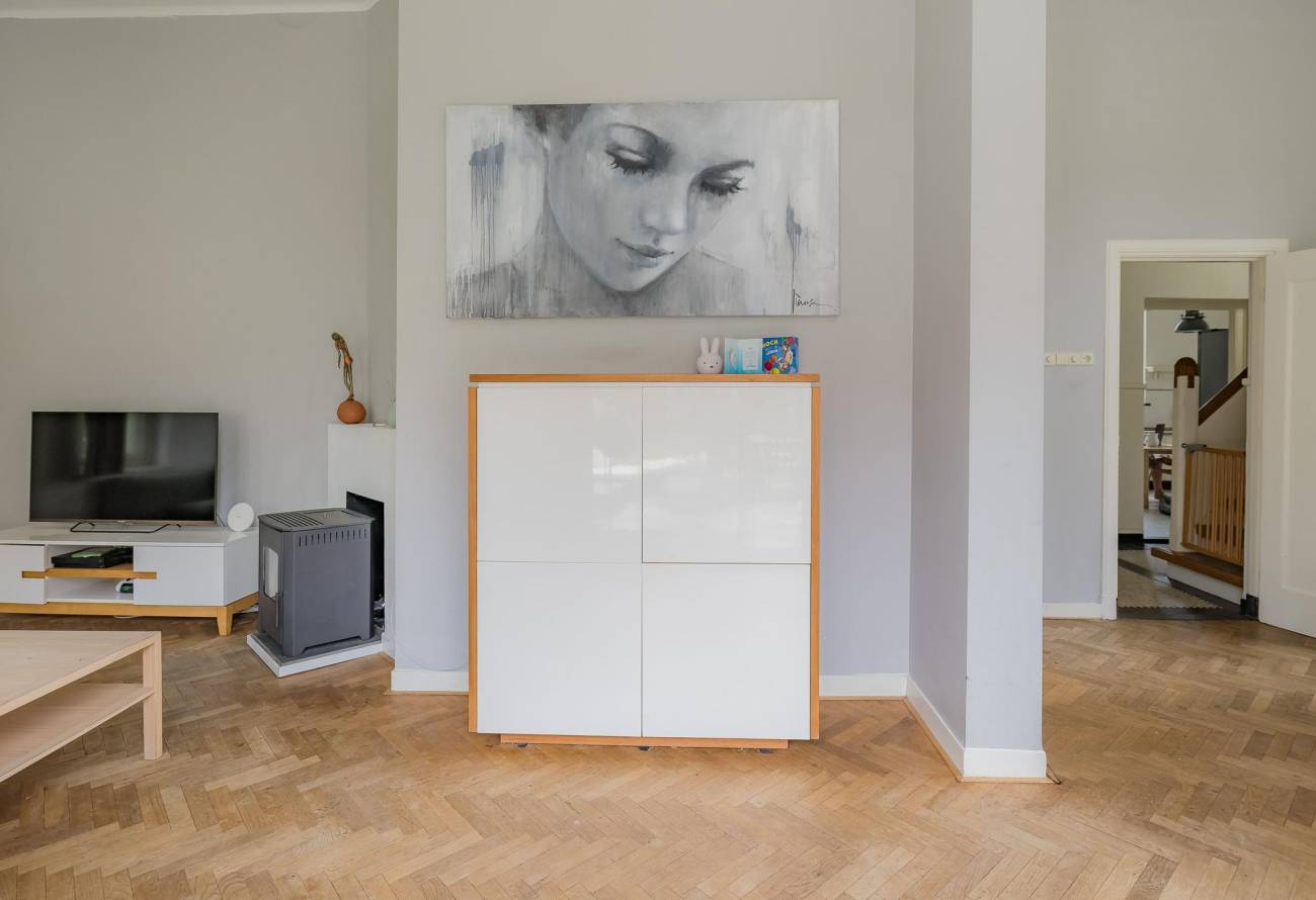 Via de eetkamer loop je zo door naar de woonkamer. Deze woonkamer is licht en sfeervol, met massief eiken visgraatparket en een pellet kachel Twee grote openslaande deuren brengen je naar de zonnige tuin en het terras op het zuidwesten.