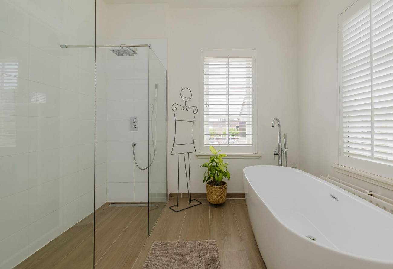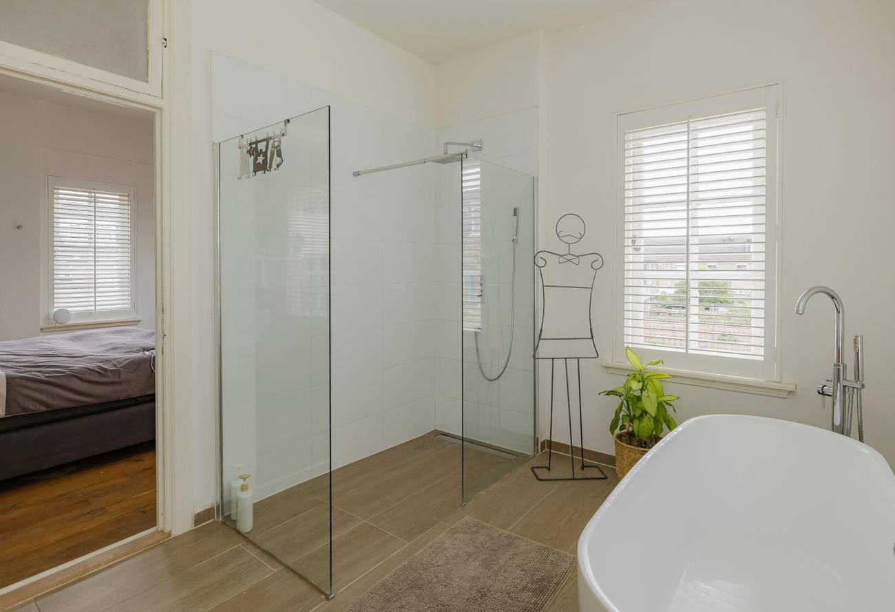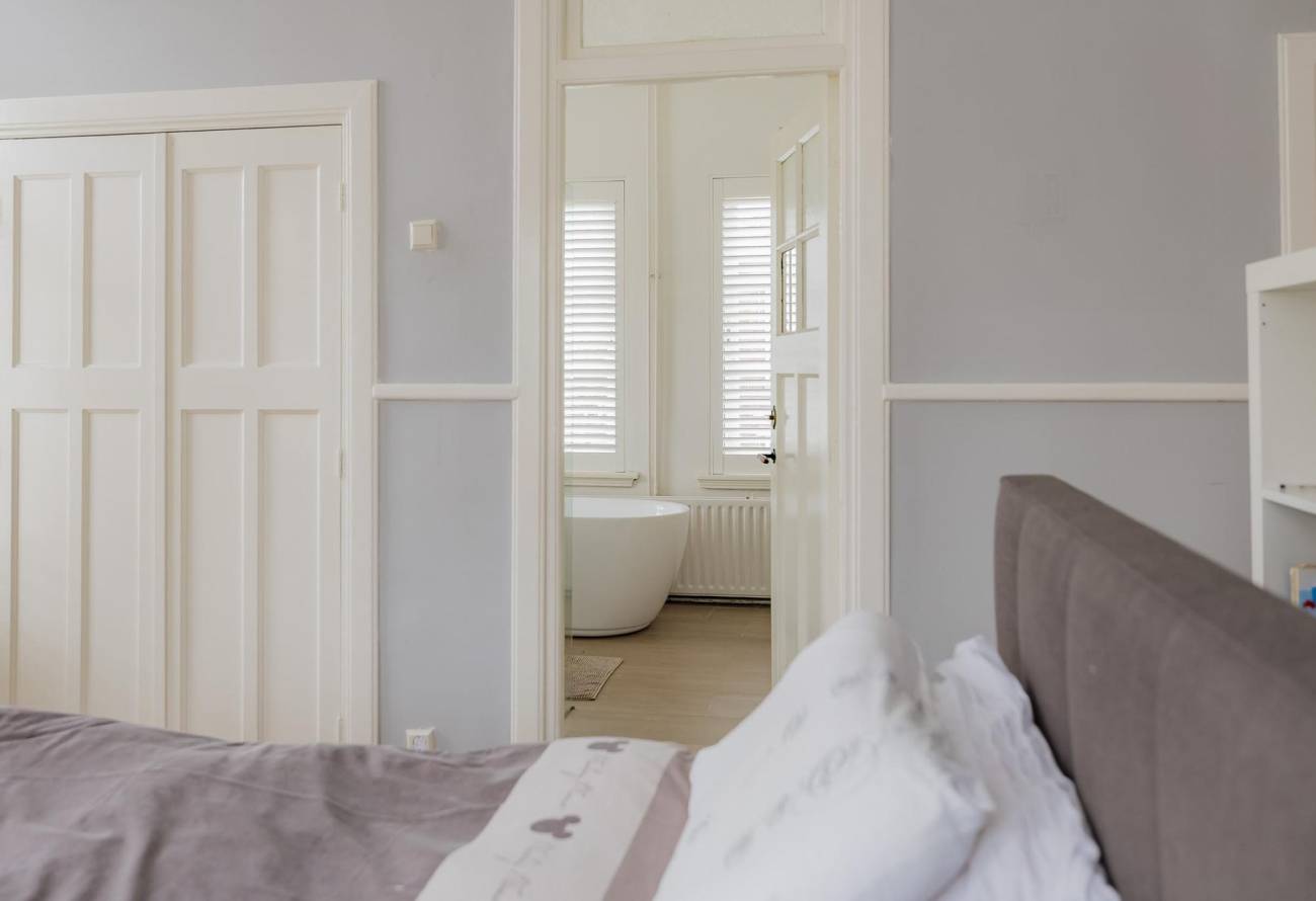 Op de overloop kom je in de zeer royale lichte hoofdslaapkamer met ingebouwde kasten met toegang naar eigen badkamer. De moderne badkamer heeft een vrijstaand ligbad, inloopdouche en een wastafelmeubel. Op de overloop is een tweede toilet.