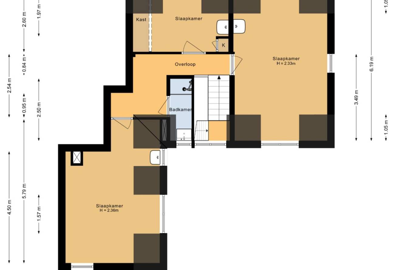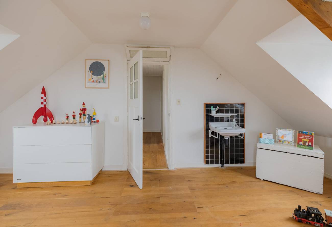 Hier vind je drie slaapkamers met dakkapellen en een 2e badkamer. Alle slaapkamers zijn v.v. een wastafel. De badkamer heeft een wastafel en een douche.