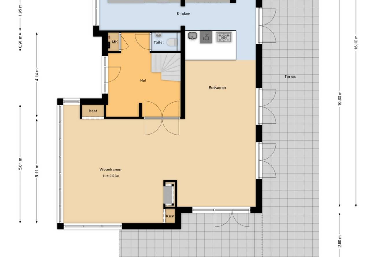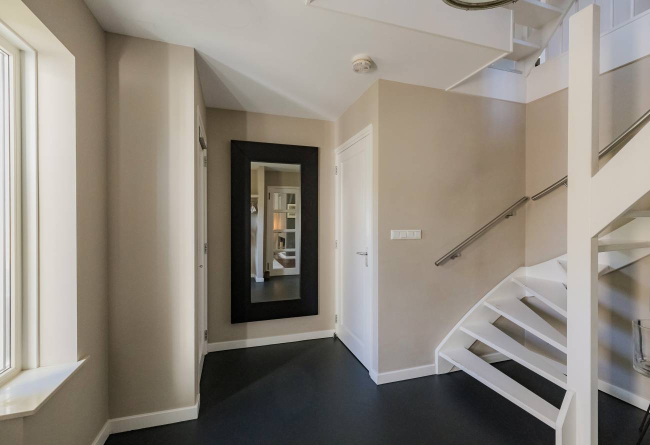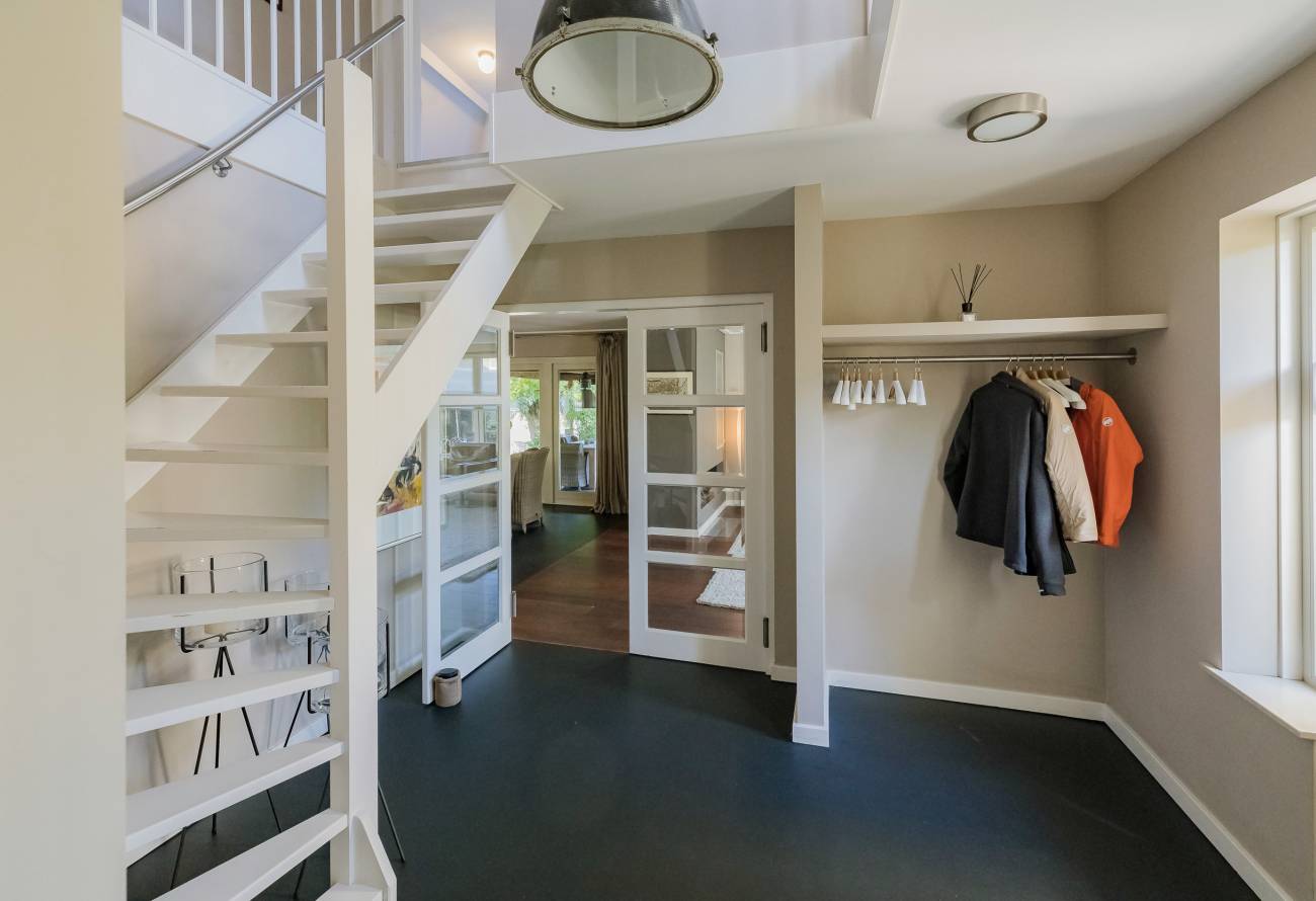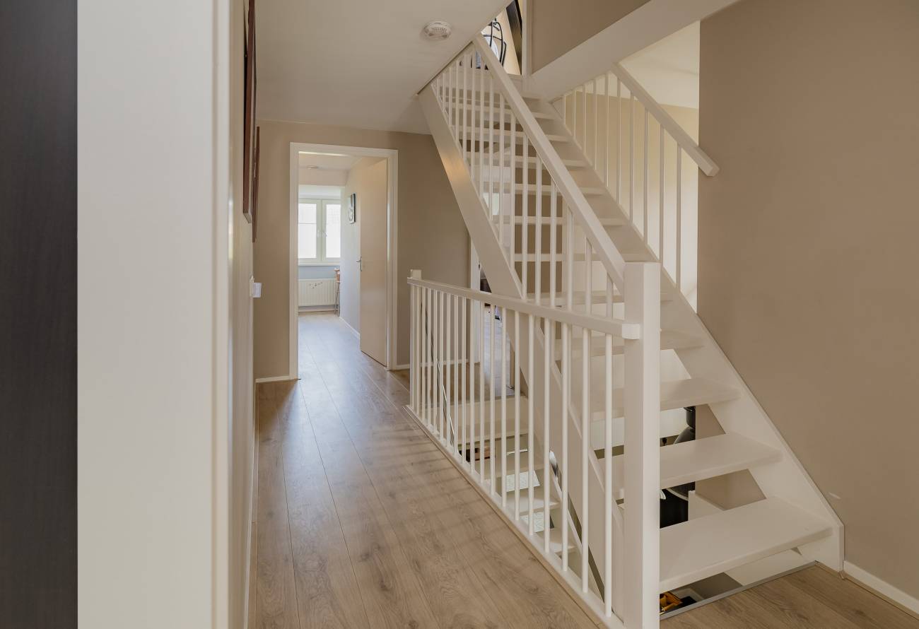 Je komt binnen in een mooie hal met vide, die meteen een gevoel van ruimte geeft. Hier vind je de garderobe, het toilet, de trap en toegang tot de woonkamer.