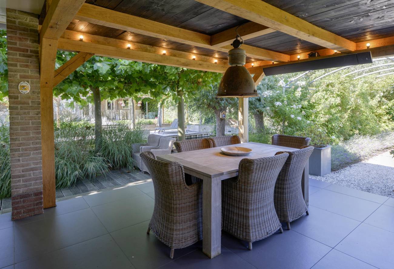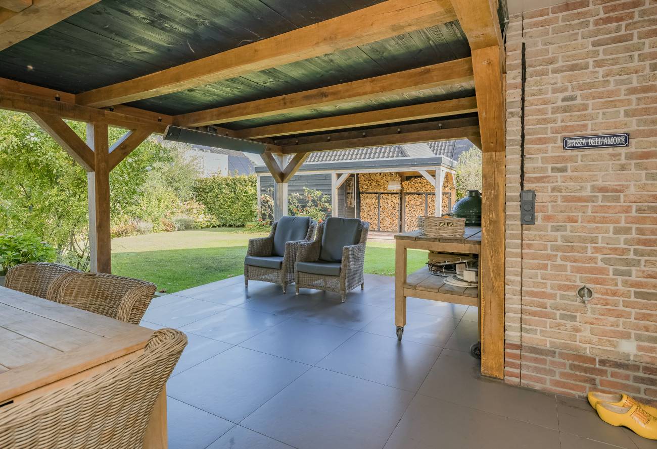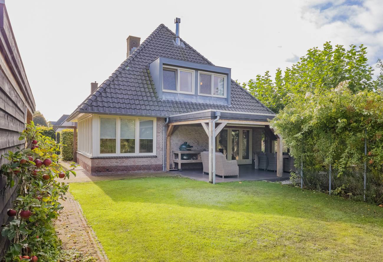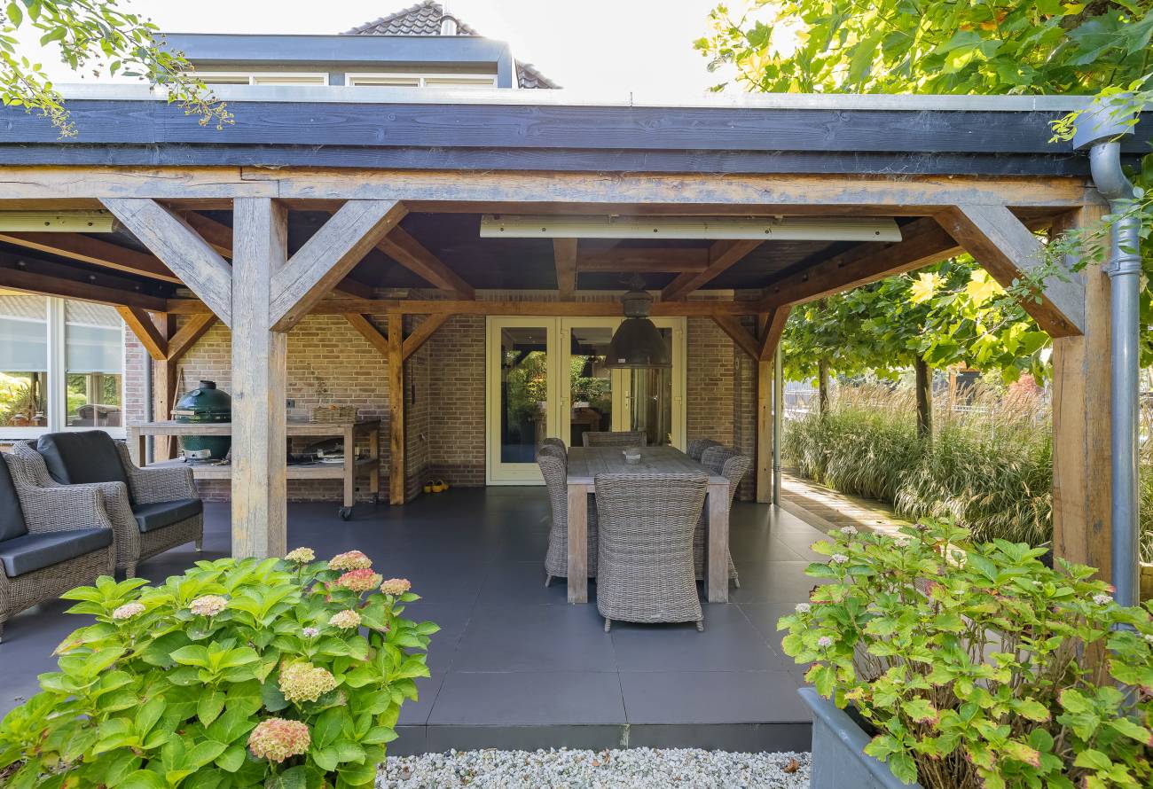 Rondom de villa ligt een fraai aangelegde tuin met volop privacy, een grote rozenboog, een tuinhuis met overkapping én een prachtige eikenhouten veranda. Hier geniet je het hele jaar door van het buitenleven; een fraaie uitbreiding van de woonkamer.