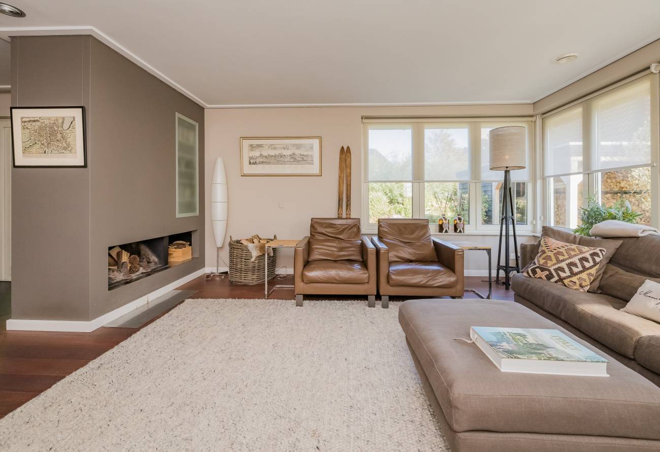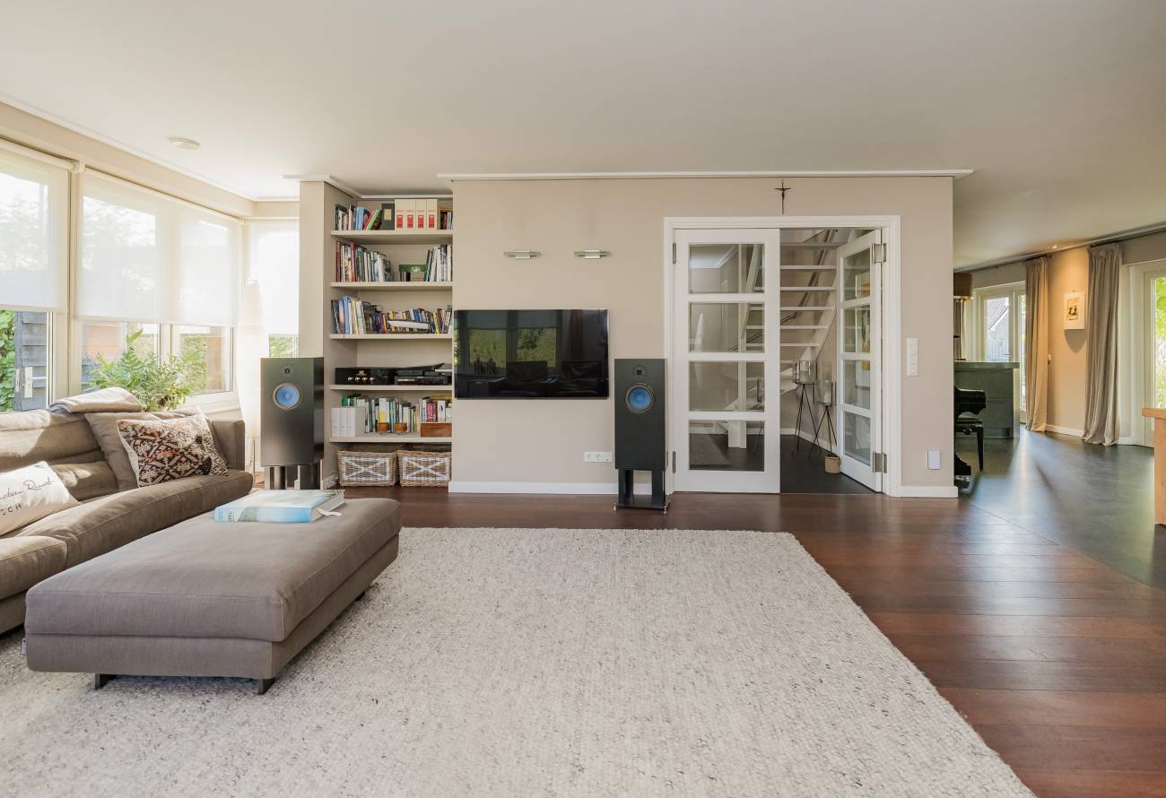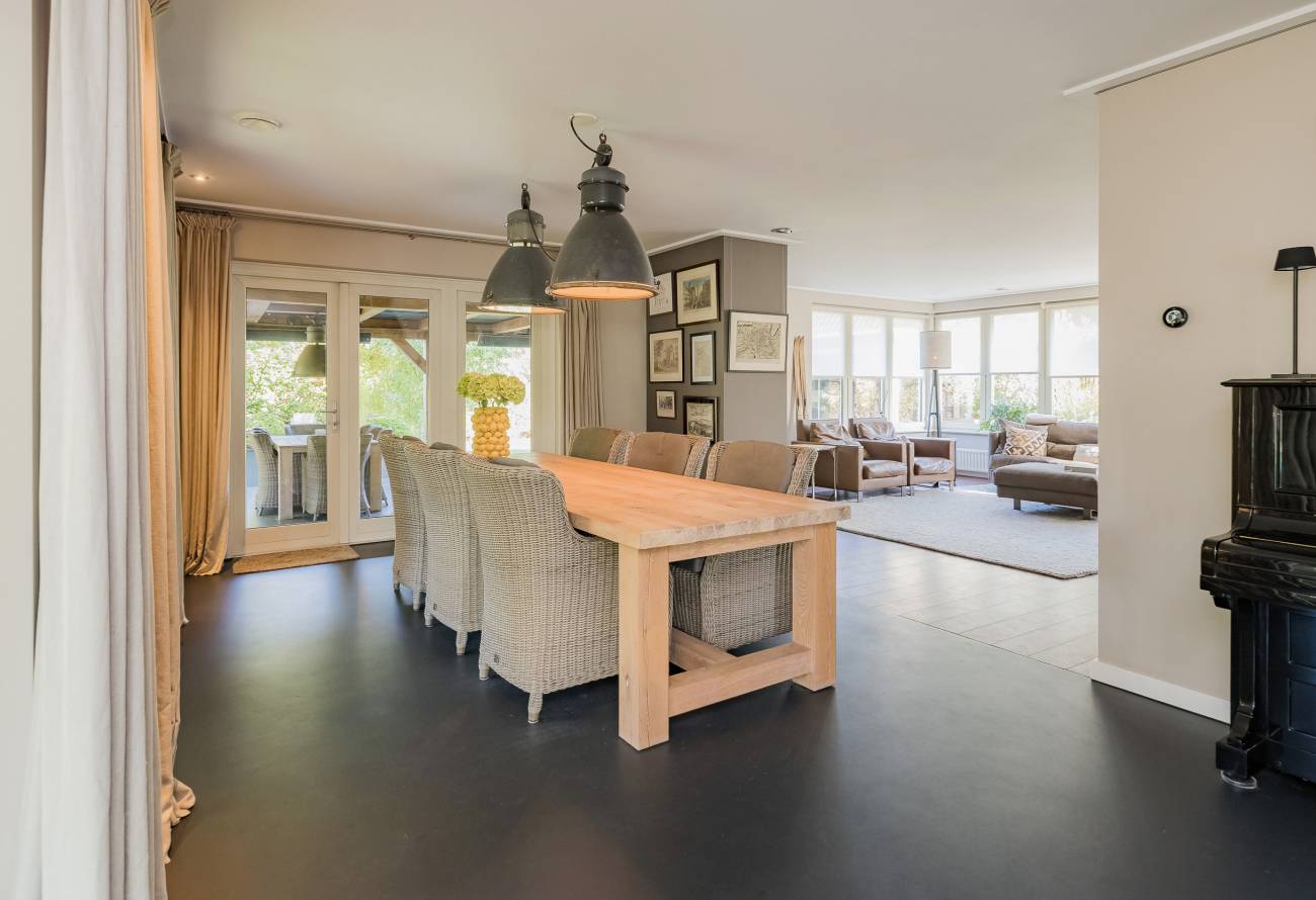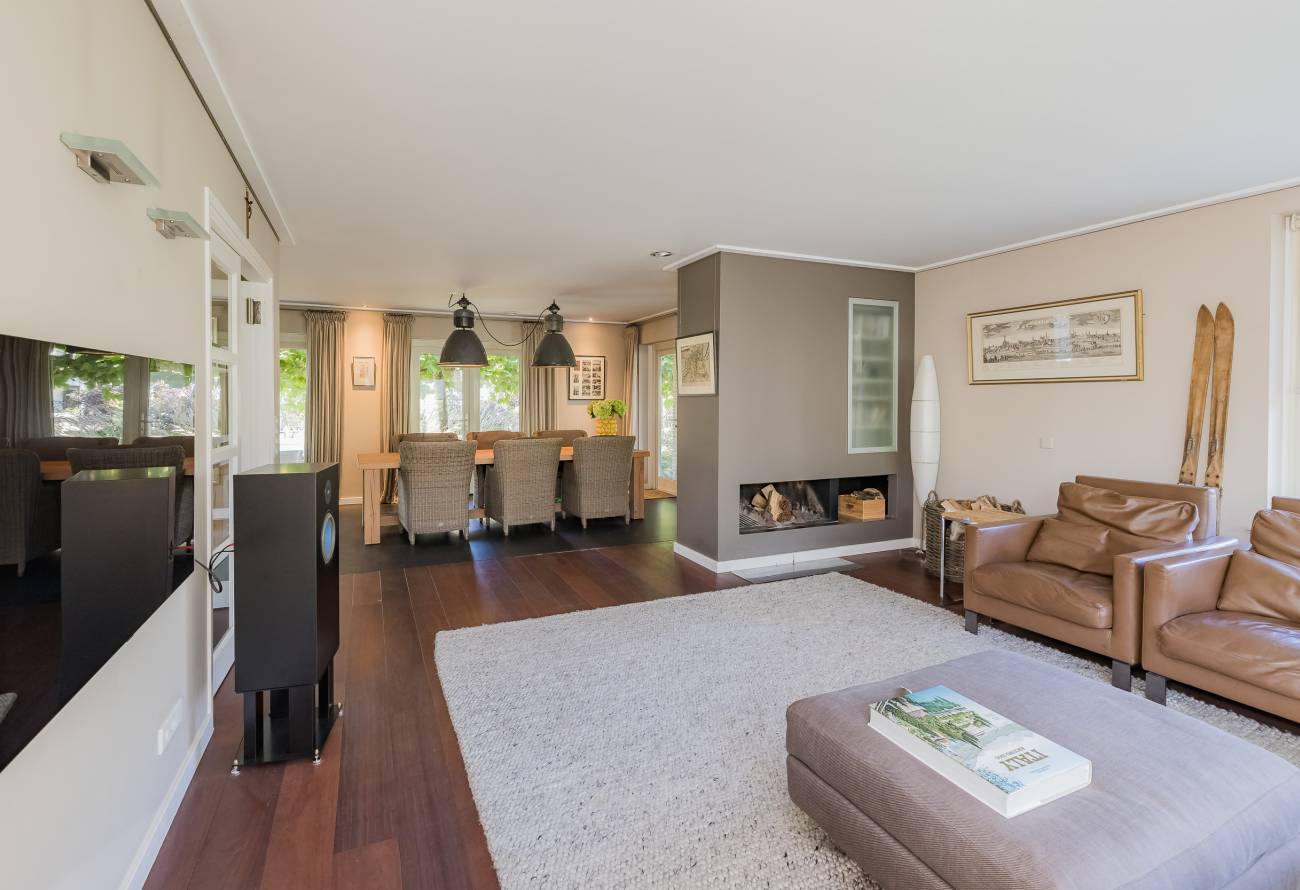 De woonkamer is heerlijk ruim en licht dankzij de grote erker en raampartijen in een moderne Engelse landhuisstijl. Aan de voorzijde geniet je van een gezellige zithoek waarin de donker Jatoba houten vloer en de open haard zorgen voor nog meer sfeer. Aan de achterzijde liggen de keuken en de eetkamer welke vier paar openslaande deuren hebben naar de tuin en de veranda.