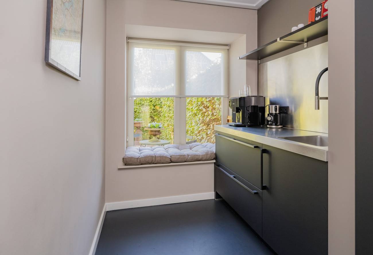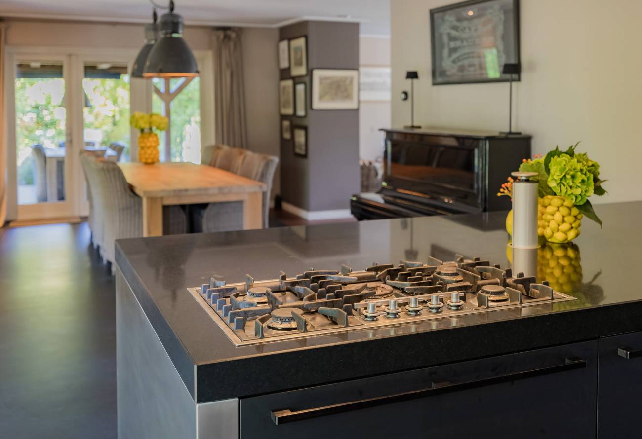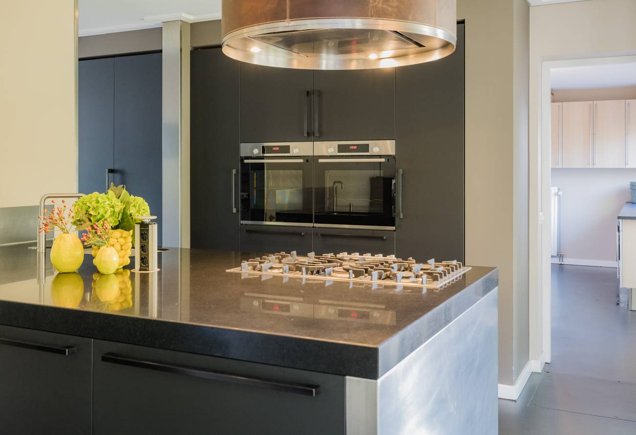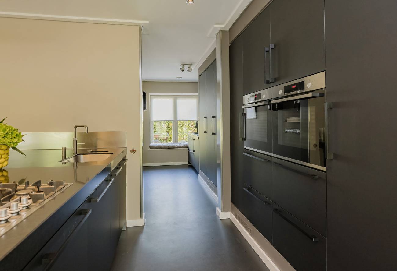 De moderne open keuken met kook/spoeleiland is compleet ingericht met hoogwaardige Miele- en Bosch-apparatuur, waaronder twee ovens, een grote vrieskast en een grote koelkast. Extra fijn: de keuken is vergroot door een kamer erbij te trekken, die is voorzien van een extra RVS werkblad met spoelbak.