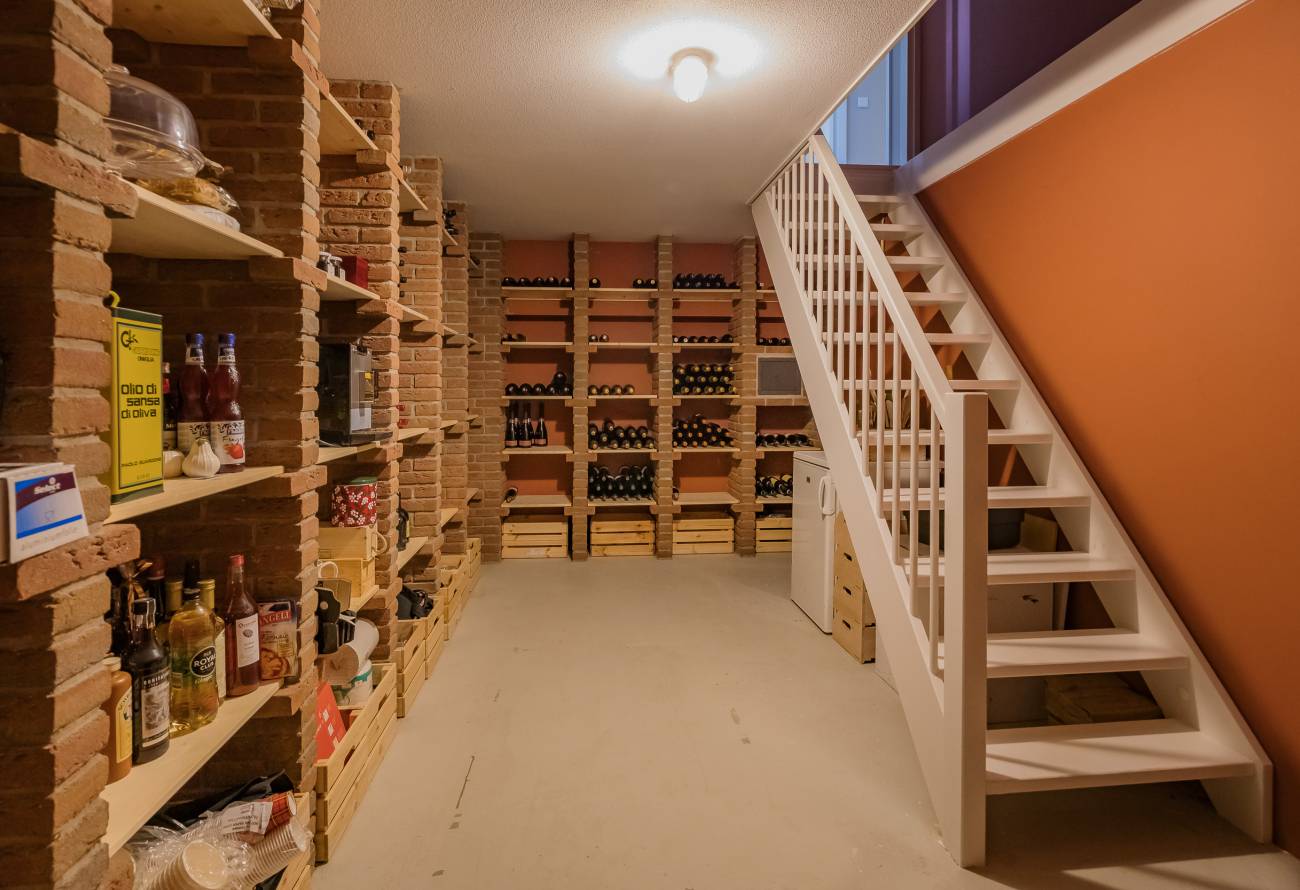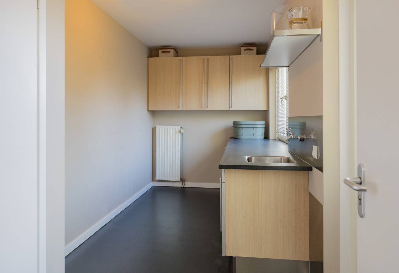 Naast de keuken ligt de praktische bijkeuken die is voorzien van een keukenblok met spoelbak en hier zijn ook de aansluitingen voor de wasmachine en droger. Van hieruit is er toegang tot de garage en het vlonderterras met aanlegplaats. Via een vaste trap bereik je de ruime, droge kelder (2,29 m hoog!), ideaal als extra opslagruimte of wijnkelder.
