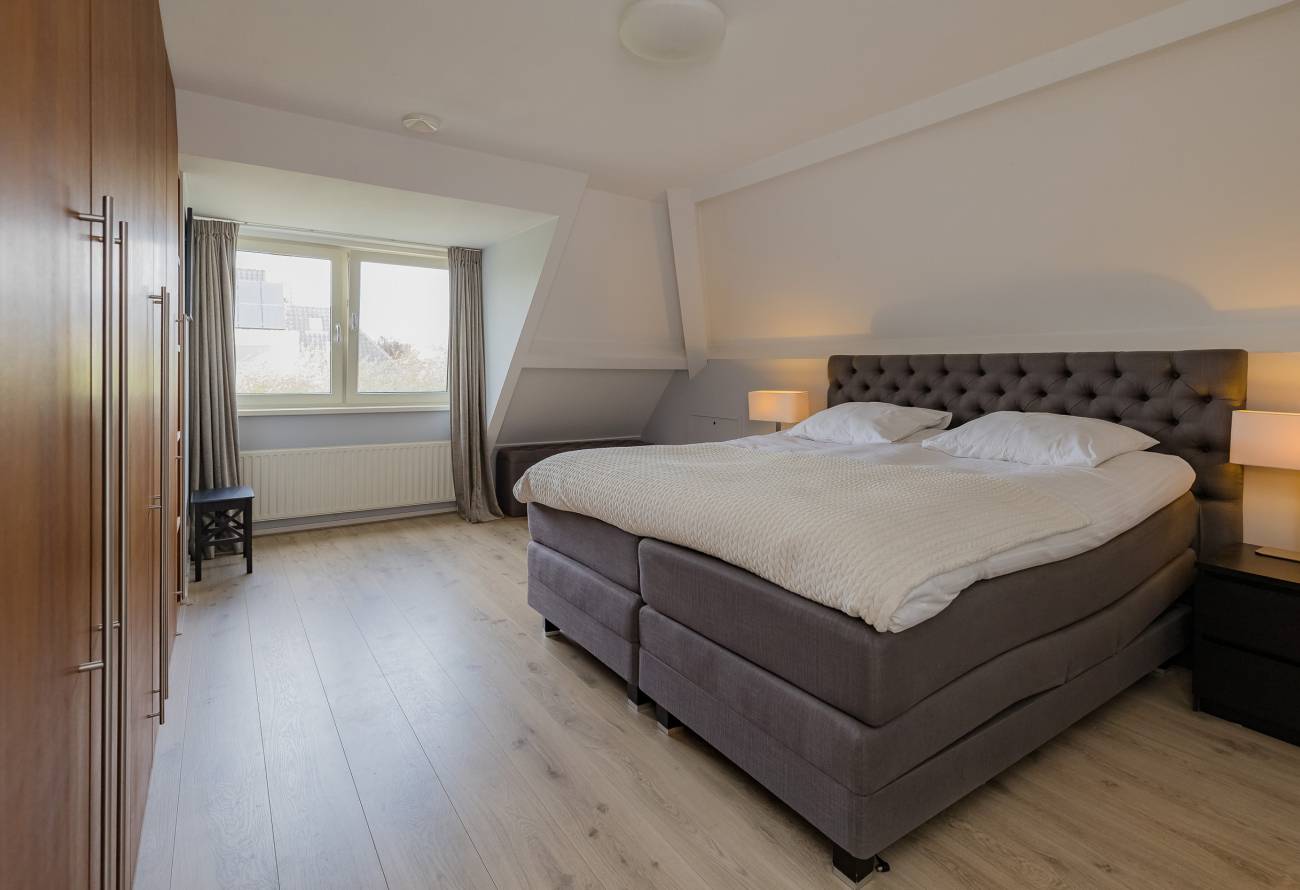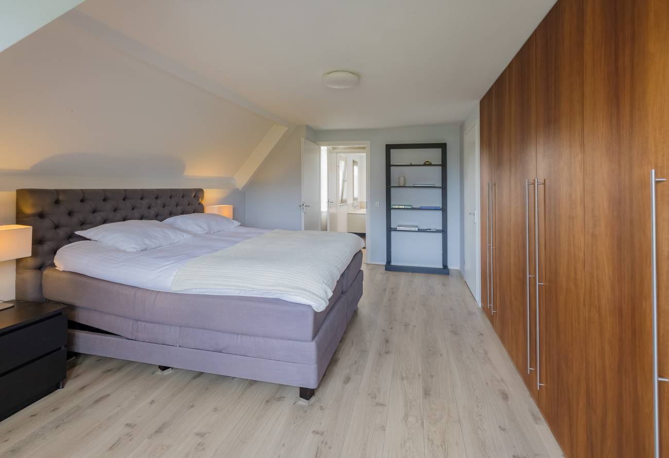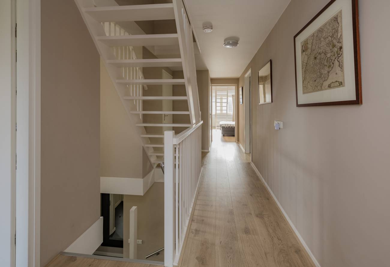 Via de open trap kom je op de eerste verdieping. De vide en overloop zorgen voor een open en ruimtelijk gevoel. Je hebt hier vier royale slaapkamers waarvan er één momenteel in gebruik is als kleedkamer.