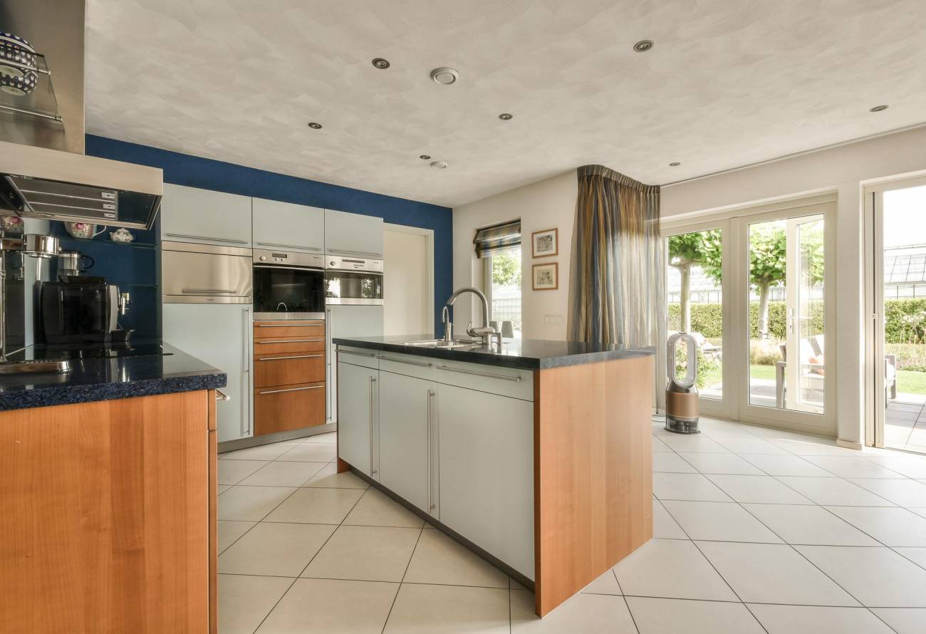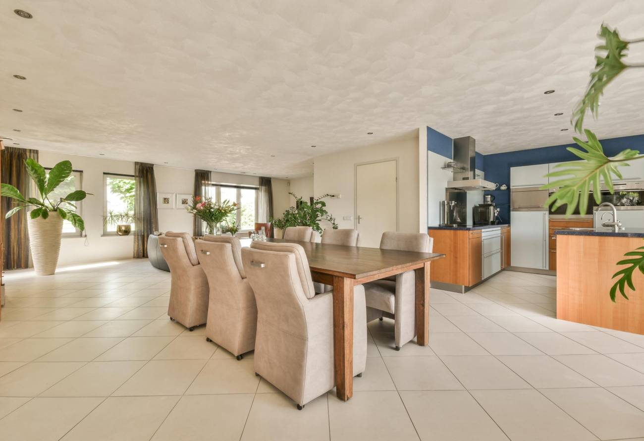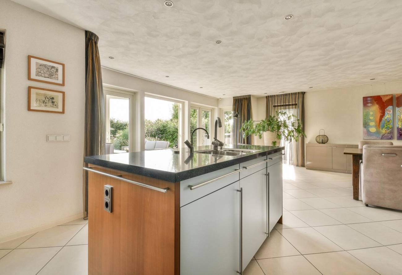 Royale hal met garderobe, royale toiletruimte met wandcloset en fontein, meterkast en hardhouten open trap, zeer grote woonkamer met erkerraam aan voorzijde en veel raampartijen aan drie zijden, dubbele deuren naar de prachtig aangelegde tuin. Open keuken met groot spoeleiland en ijsblauwe kasten afgewerkt met beuken details, de werkbladen zijn van donkerblauw graniet en er is een Quooker, stoomoven, combi-oven, grote koelkast, vaatwasmachine, inductie kookplaat en afzuigkap (Miele apparatuur), toegang tot ruime bijkeuken met aansluiting wasapparatuur en deur naar tuin.