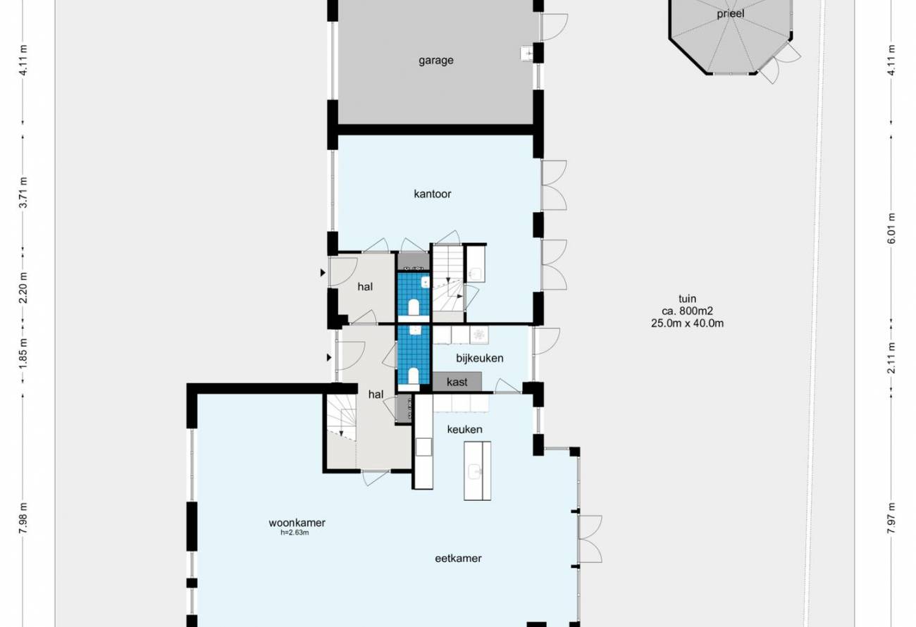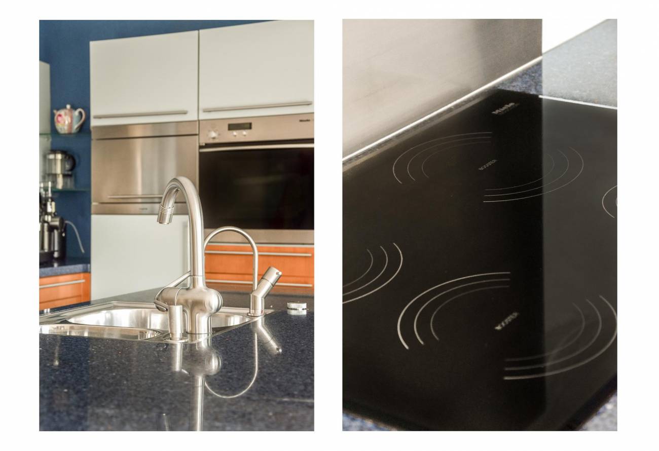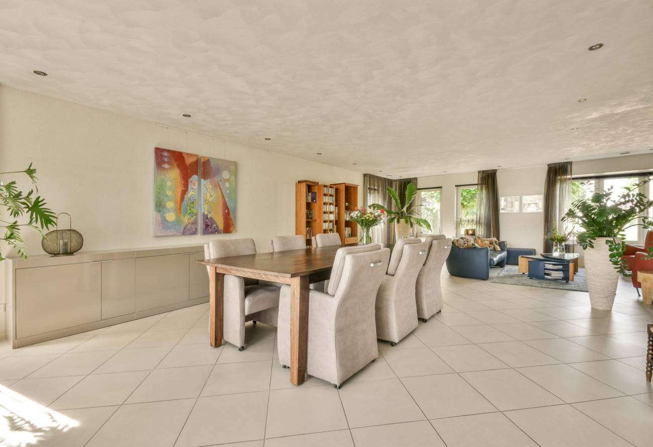 Royale hal met garderobe, royale toiletruimte met wandcloset en fontein, meterkast en hardhouten open trap, zeer grote woonkamer met erkerraam aan voorzijde en veel raampartijen aan drie zijden, dubbele deuren naar de prachtig aangelegde tuin. Open keuken met groot spoeleiland en ijsblauwe kasten afgewerkt met beuken details, de werkbladen zijn van donkerblauw graniet en er is een Quooker, stoomoven, combi-oven, grote koelkast, vaatwasmachine, inductie kookplaat en afzuigkap (Miele apparatuur), toegang tot ruime bijkeuken met aansluiting wasapparatuur en deur naar tuin.