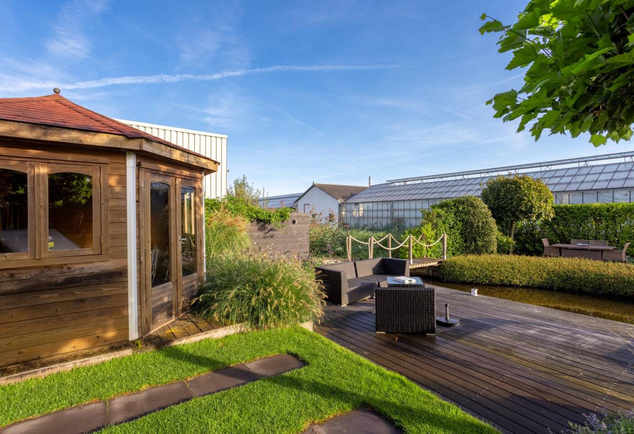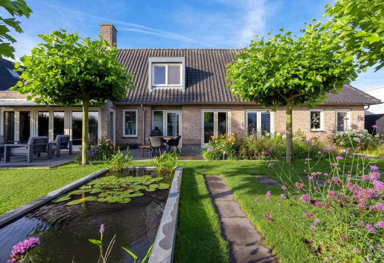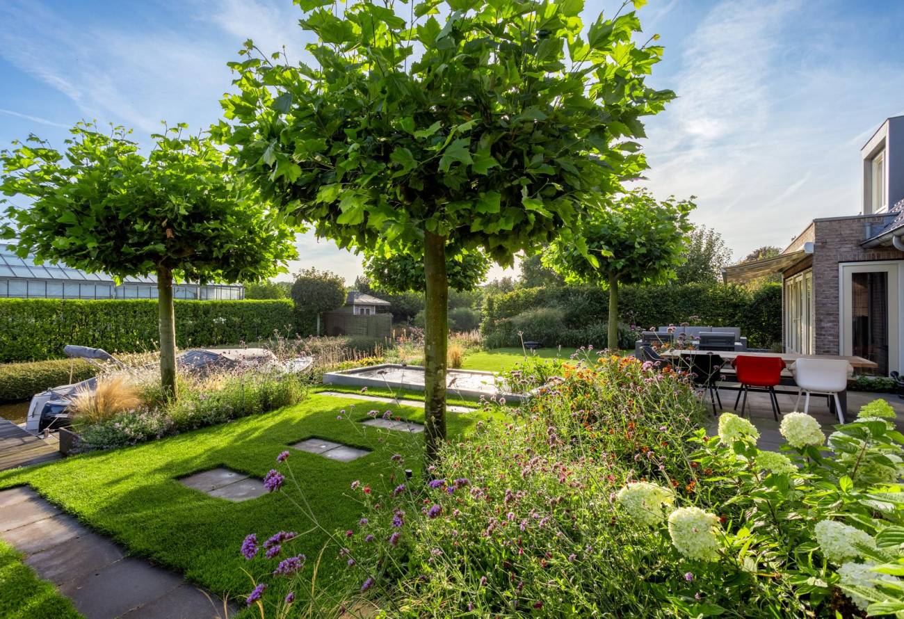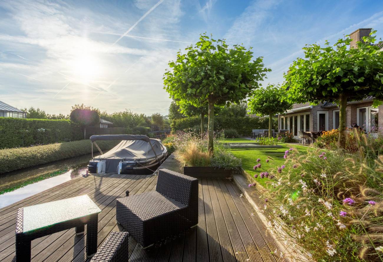 mooie vijver, diverse terrassen, aanlegsteiger en grasmat met beregening en automatische motormaaier.