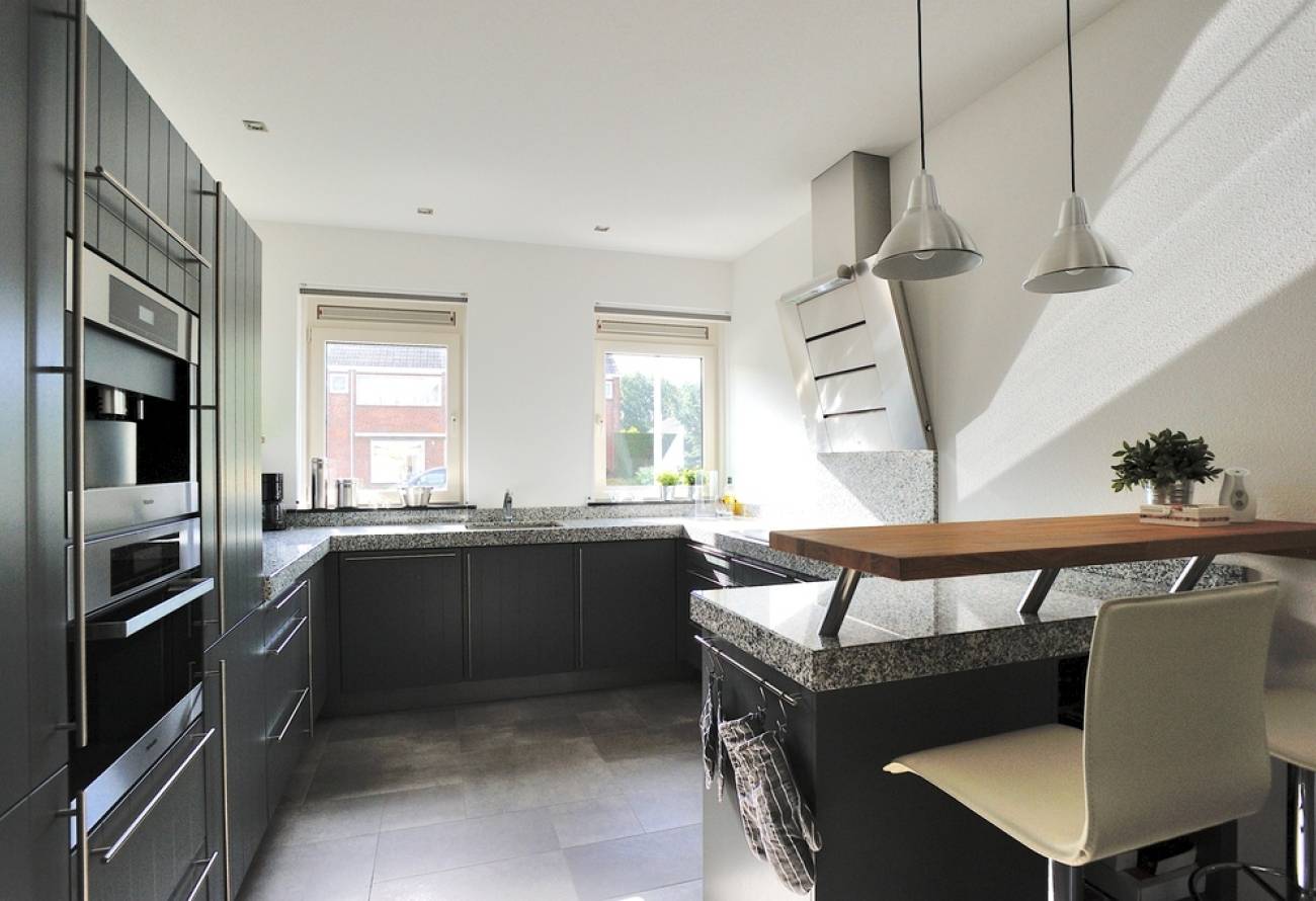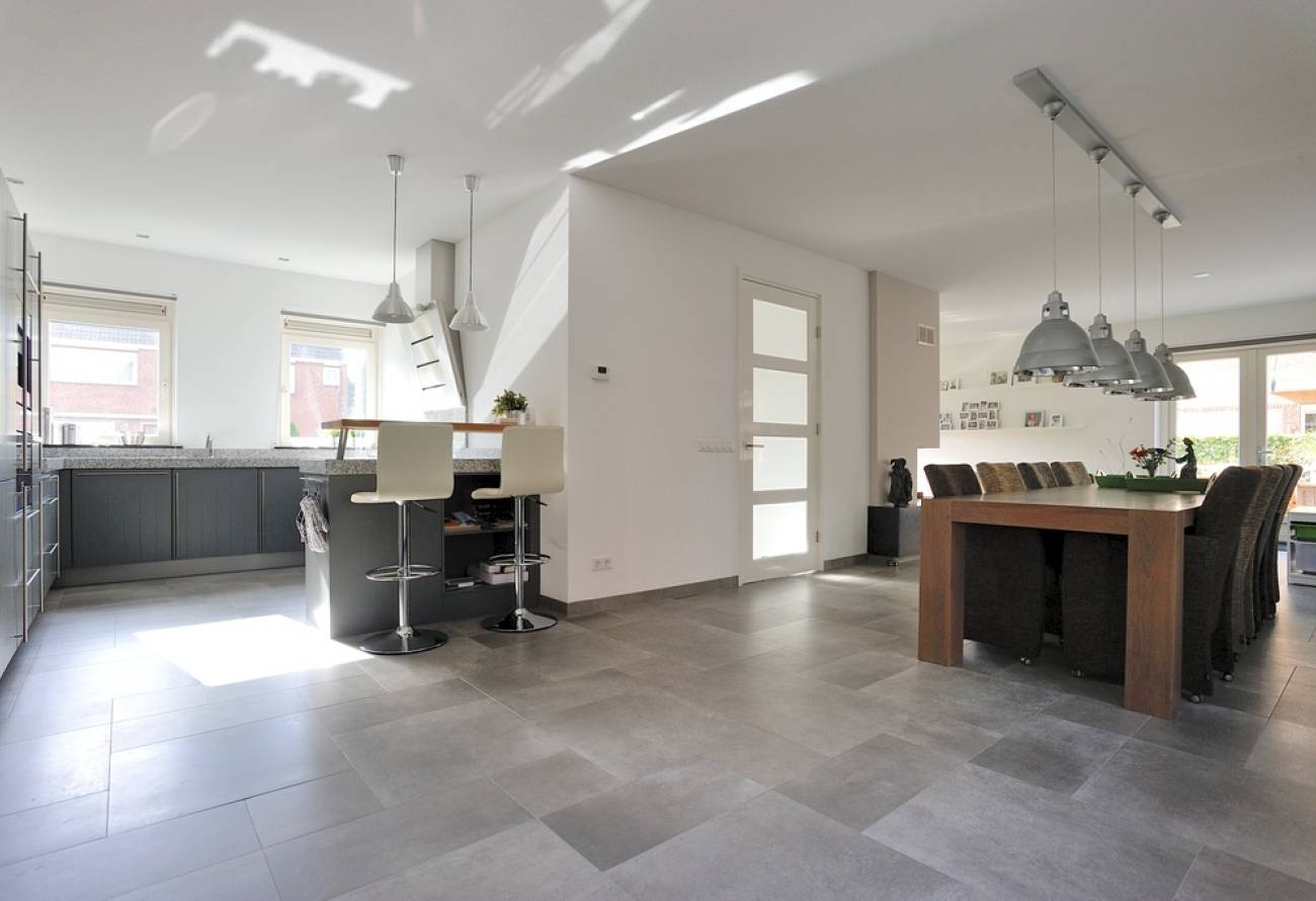 Indeling: grote hal met deur naar kelder, royale woonkamer met veel lichtinval, dubbele deuren naar veranda en tuin, open haard, open keuken met zeer luxe antraciet kleurige inrichting, granieten werkblad en eetbar, luxe inbouwapparatuur. De gehele begane grond is v.v. antraciet tegelvloer met vloerverwarming. Achterentree, gang en inpandige garage met bergzolder en elektrische deur.