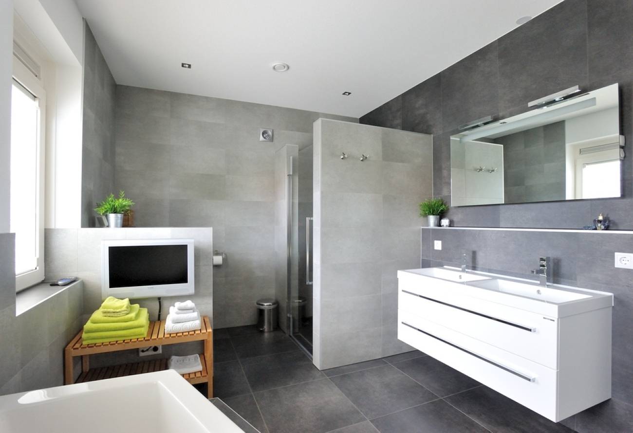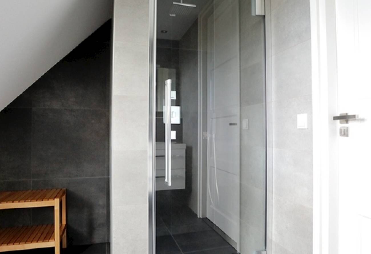 2e Etage: 2 grote slaapkamers, moderne 2e badkamer met douchecabine, wandcloset en wastafel in meubel.