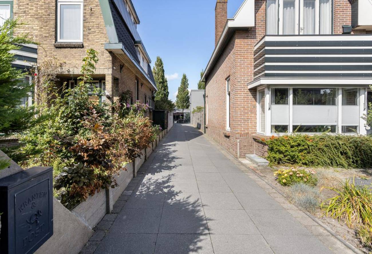 De lange oprit ligt heerlijk verscholen tussen huisnummer 1 en 3 en biedt volop privacy. Hier is er ruimte om meerdere auto’s achter elkaar te parkeren.