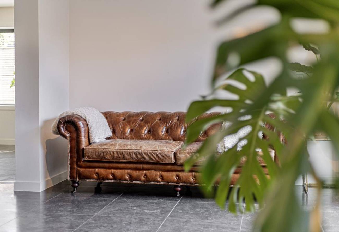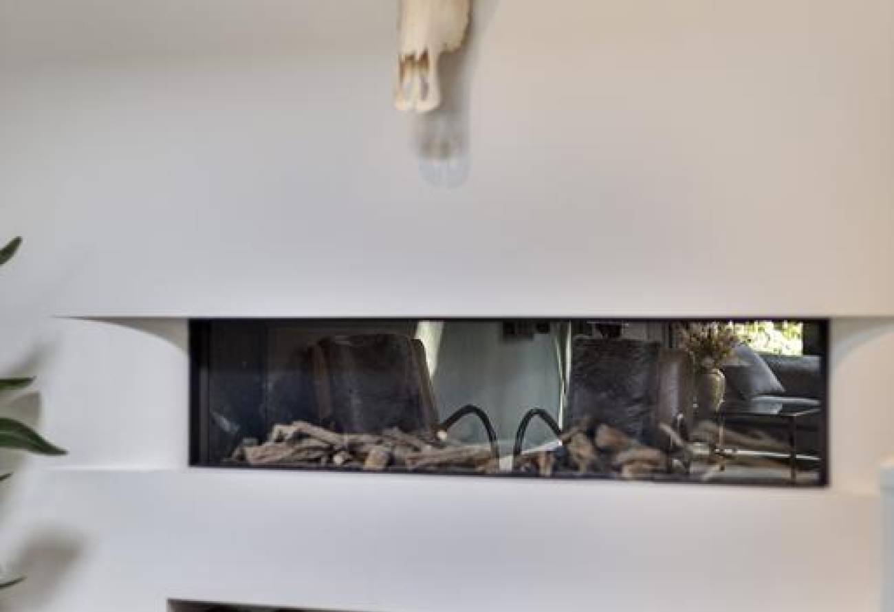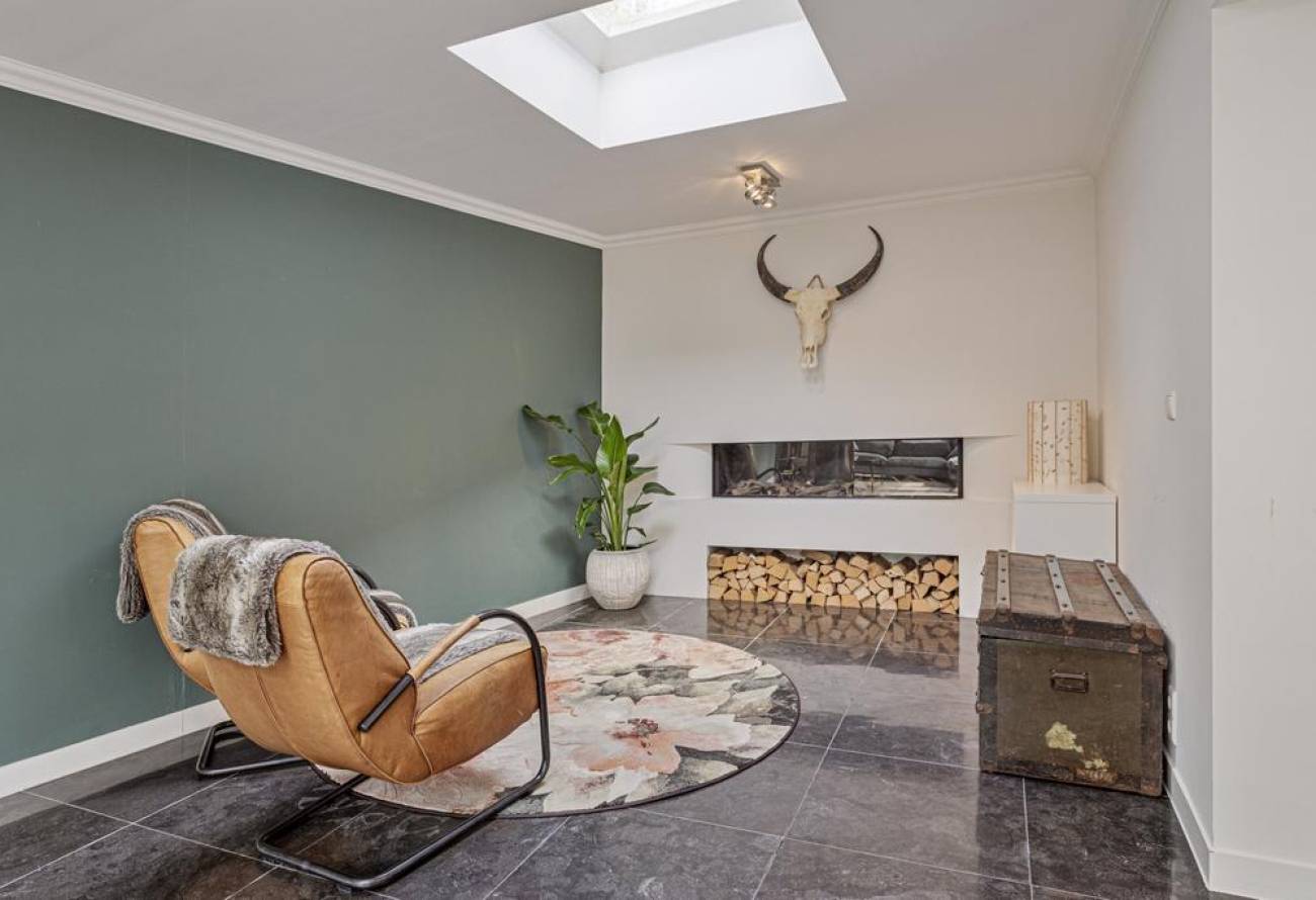 Vanuit de keuken kom je de woonkamer binnen, waar je kunt ontspannen bij de prachtige Piet Boon haard.
