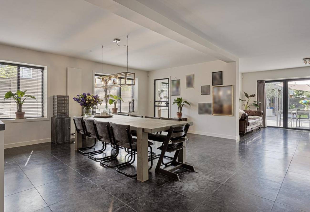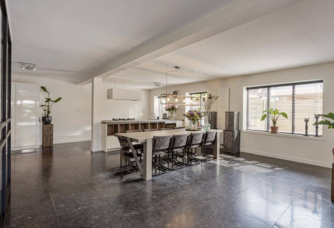 De ruimte is riant opgezet, waardoor er voldoende plek is voor een grote eettafel met comfortabele stoelen.