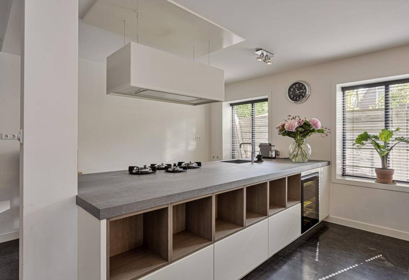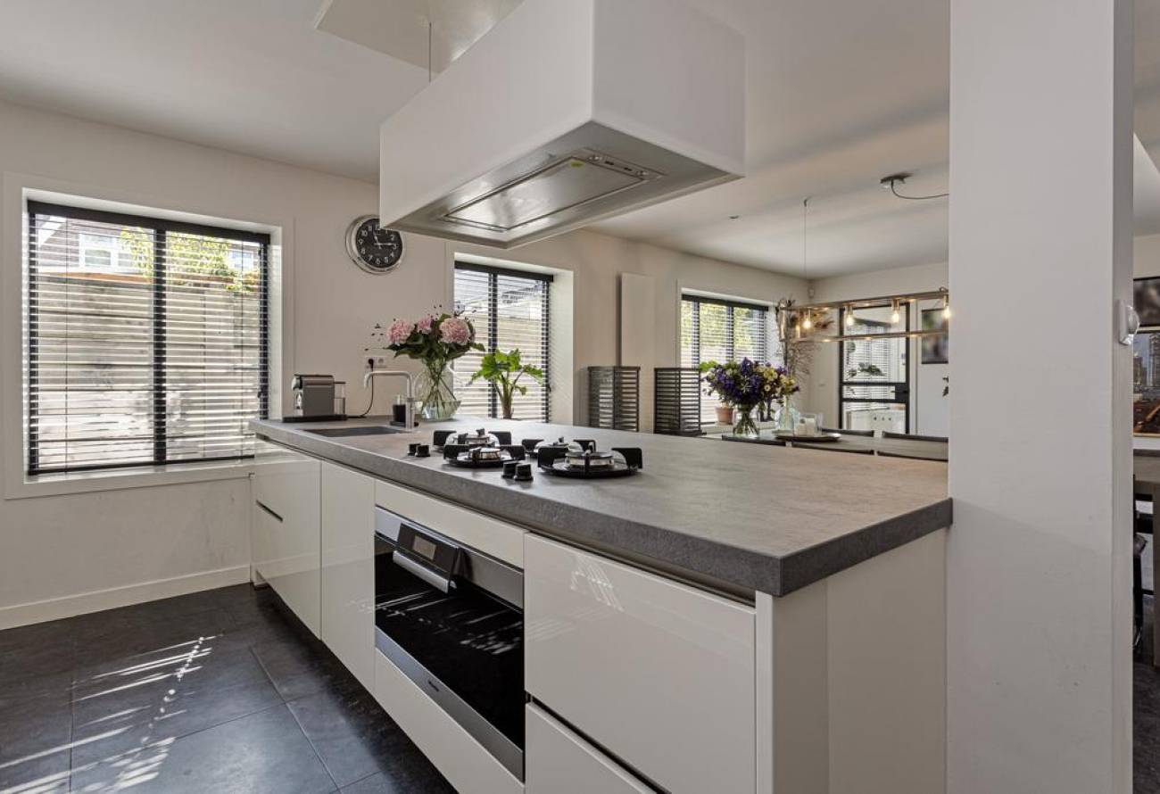 Voor het ultieme gebruiksgemak is er een Quooker aanwezig, evenals diverse hoogwaardige inbouwapparatuur, waaronder een eigentijdse afzuigkap die zowel functioneel als stijlvol is.