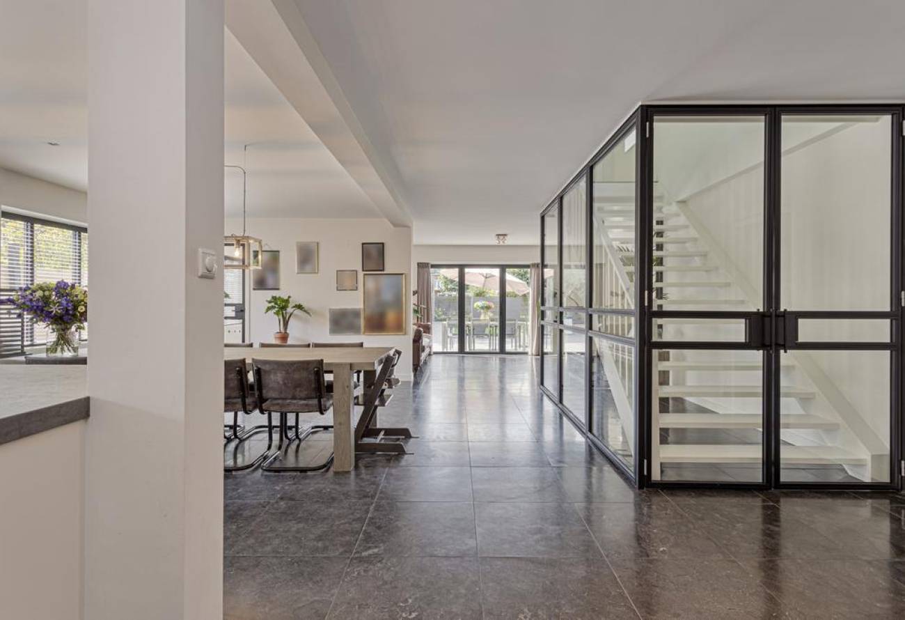 De open trap vanuit de keuken is een ware eyecatcher, met glazen ramen en donkere kozijnen die de moderne uitstraling van de villa versterken.