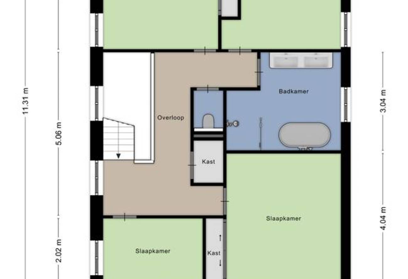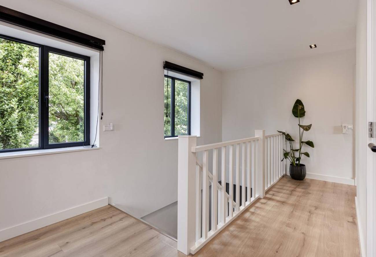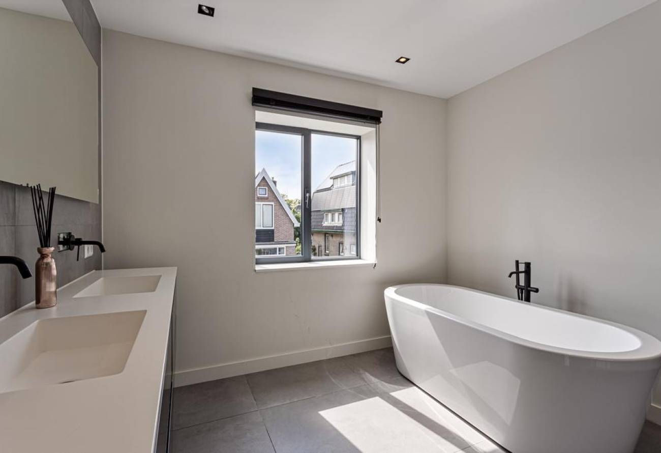 De moderne badkamer biedt een inloopdouche, ligbad en dubbele wastafel. Een apart toilet op de overloop completeert deze verdieping.