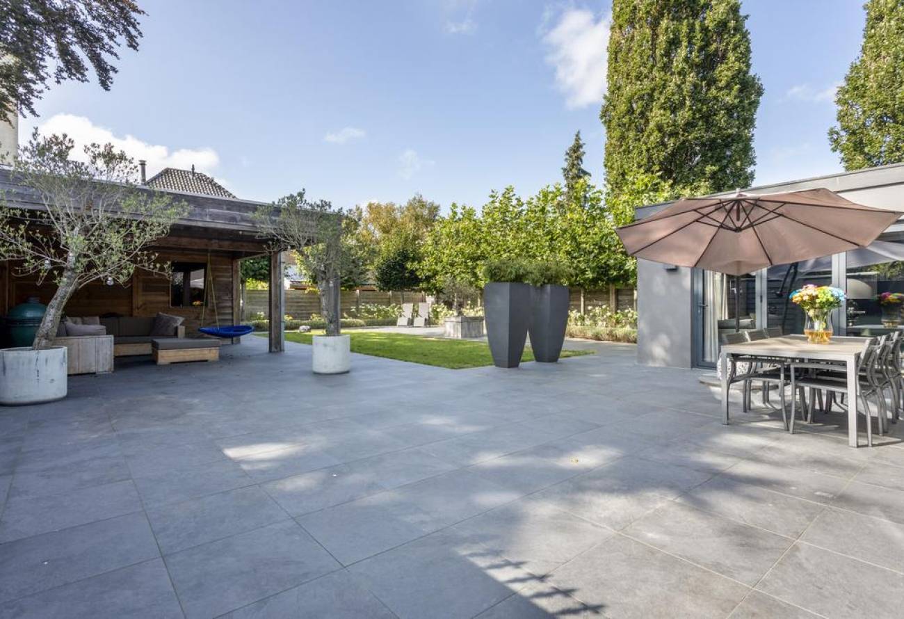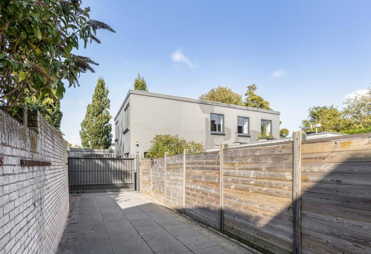 Via een modern elektrisch toegangshek kom je in de tuin met direct aan je rechterhand een deur naar de woning.