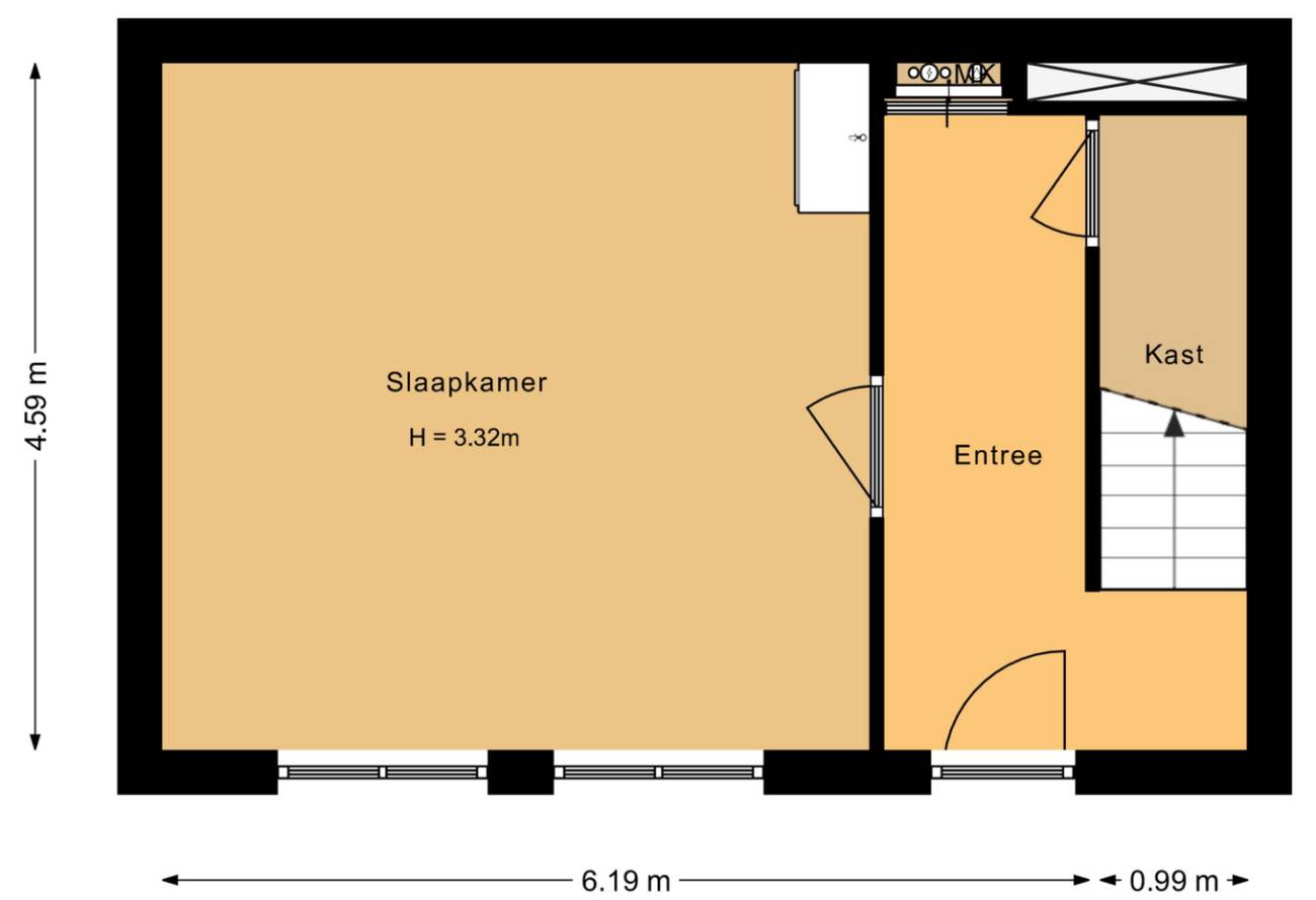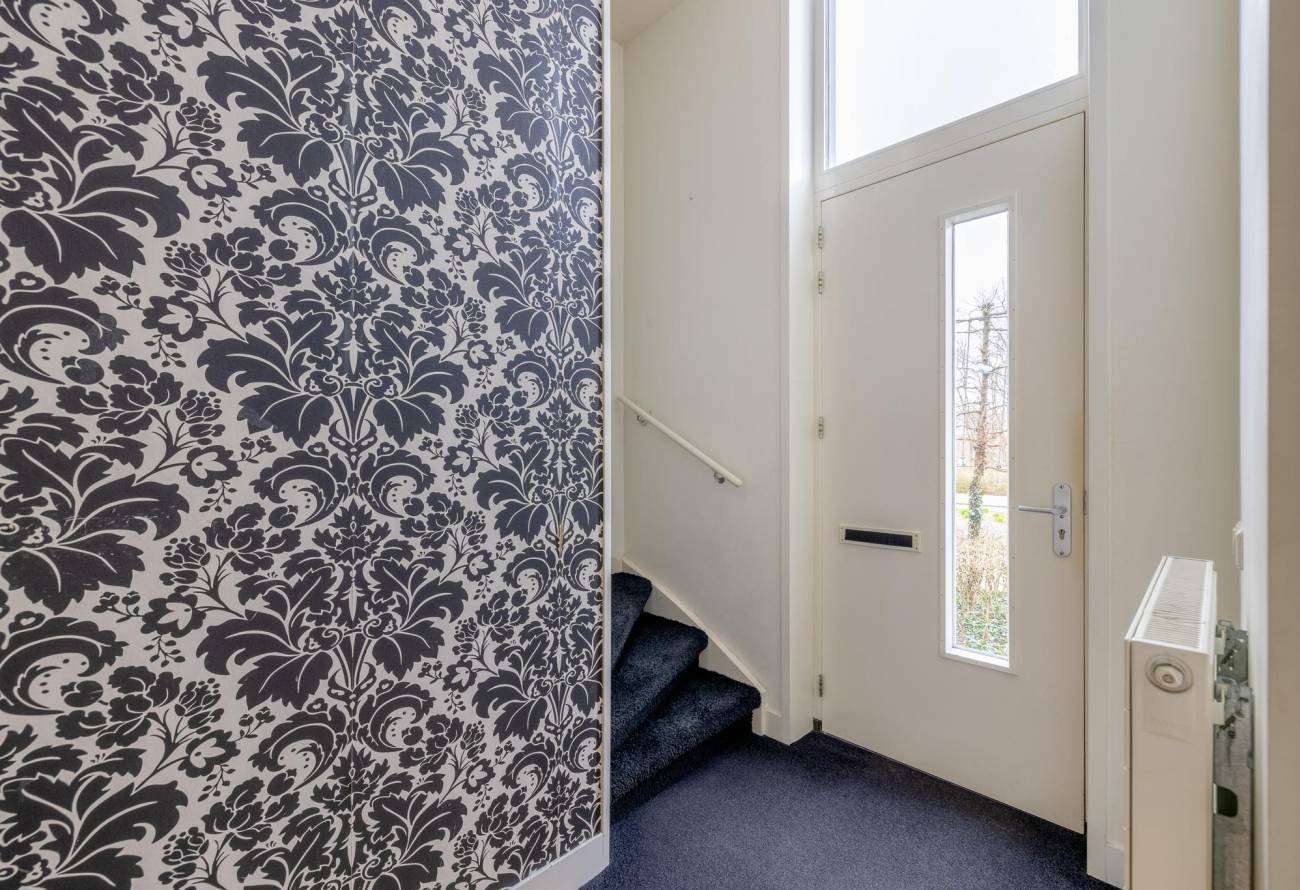Via verhoogde entree kom je in een hal met deur naar slaapkamer en trap naar de woonverdieping.