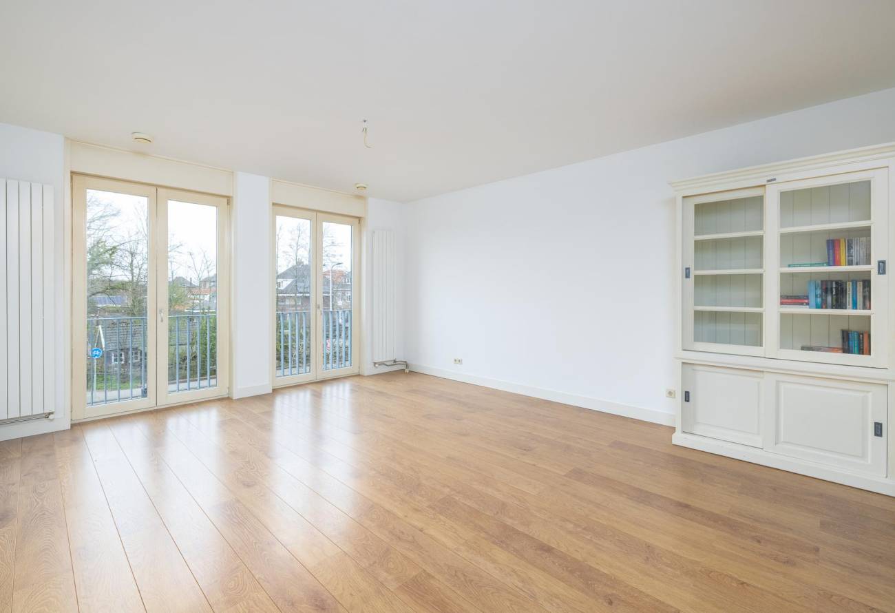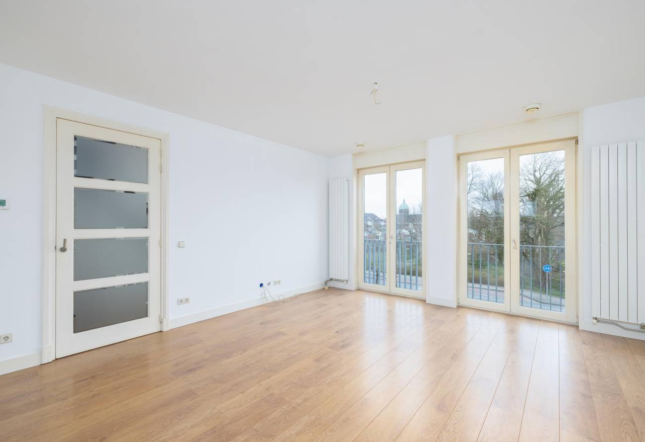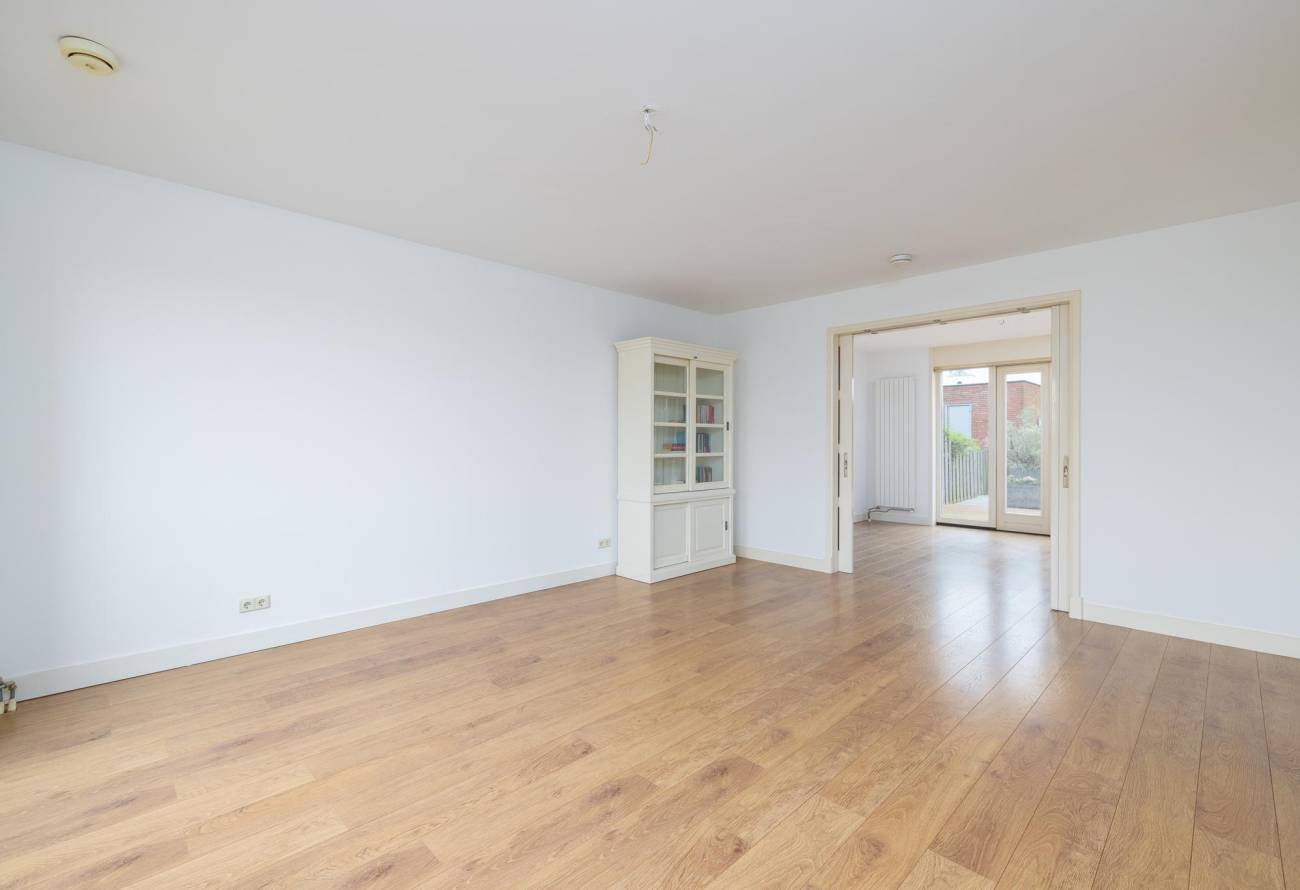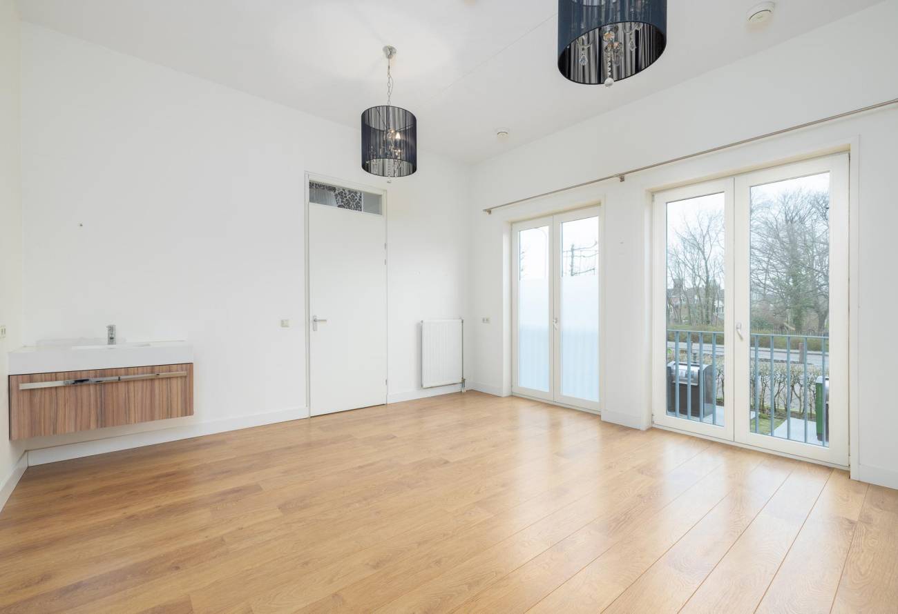 compleet met een eigen wastafel en deuren die uitkomen op niet één, maar twee Franse balkons. Deze ruimte is perfect geschikt voor een kantoor aan huis of een praktijkruimte.