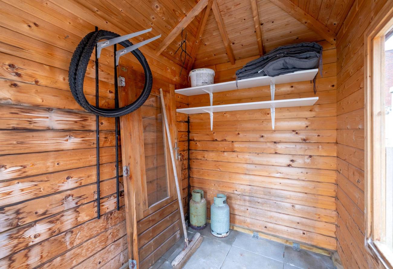 Dit terras, voorzien van betegeling, houten schuttingen en een charmante blokhut, biedt de perfecte ruimte voor buitenentertainment, ontspanning en zonnebaden.