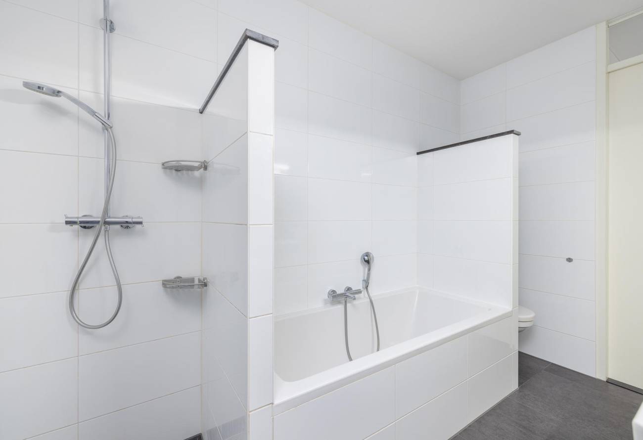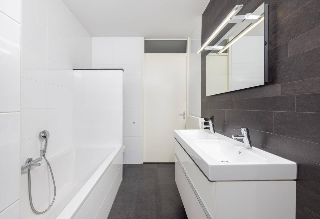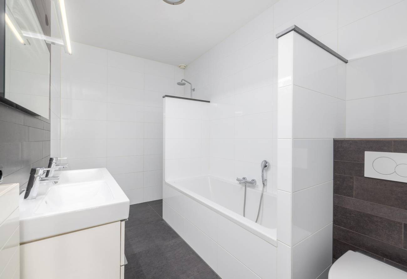 De lichte badkamer is voorzien van een ligbad, toilet, dubbele wastafel en een aparte douche, waardoor het comfort van deze woning wordt geoptimaliseerd.