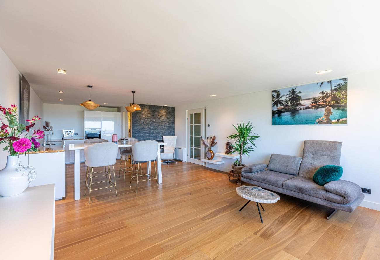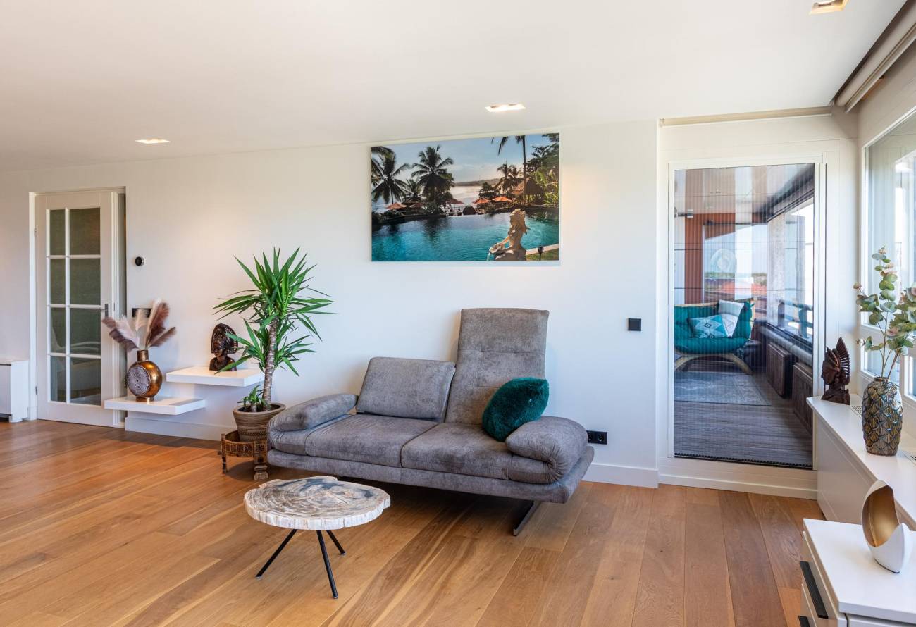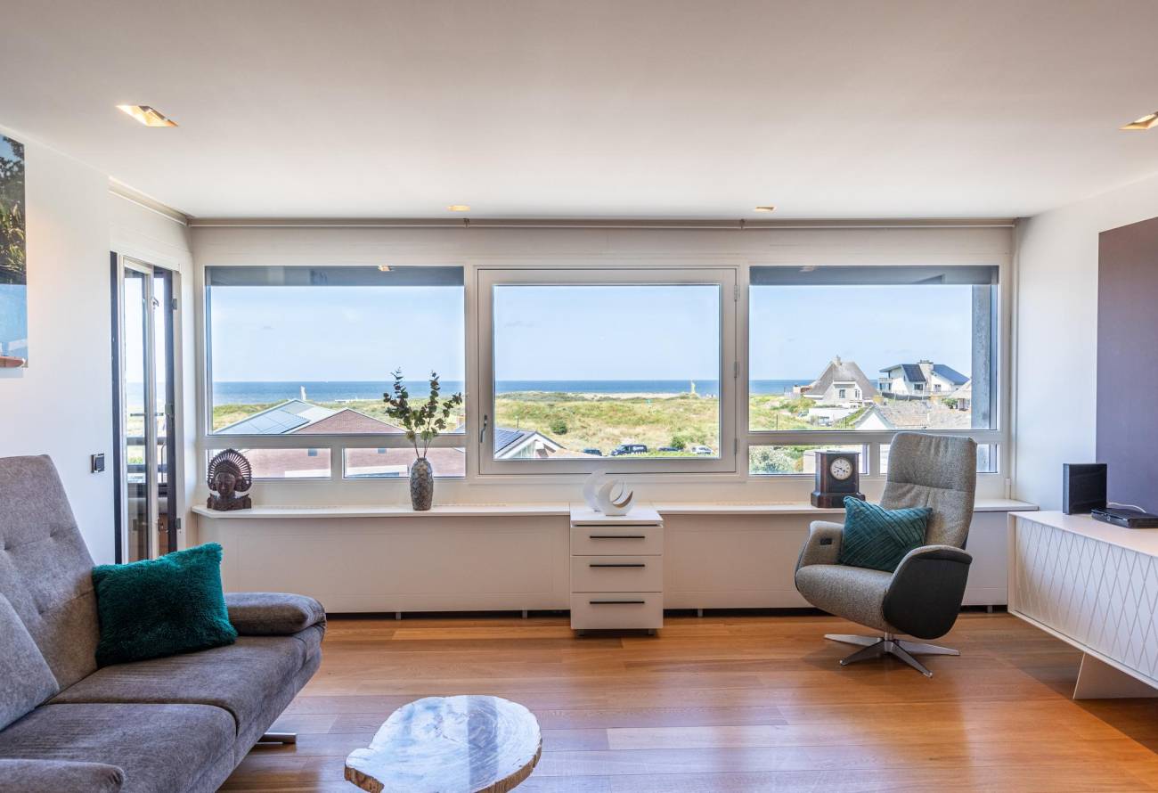 De lichtrijke woonkamer met balkon heeft een raampartij over de gehele breedte waardoor er een geweldig weids uitzicht is over de zee.