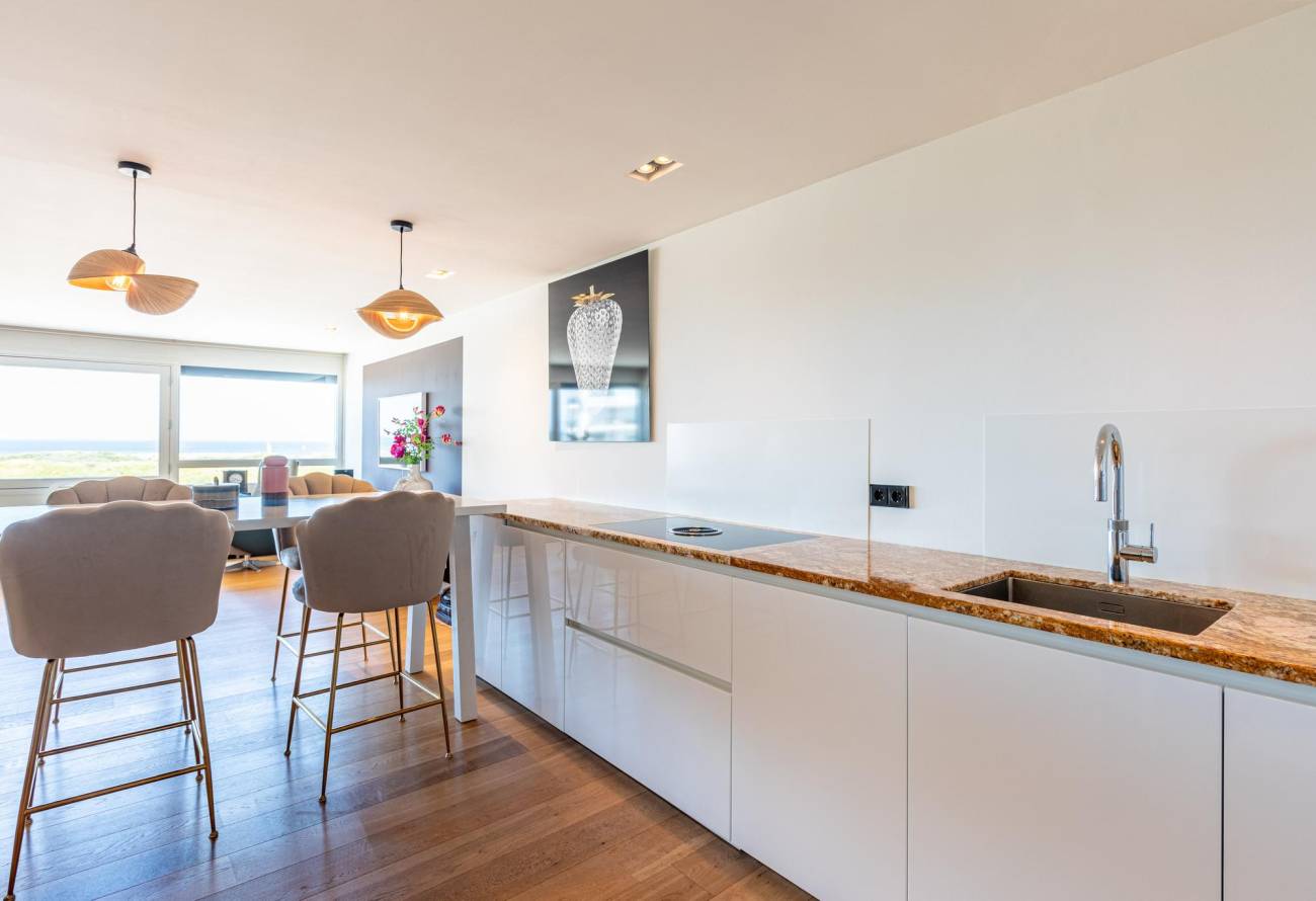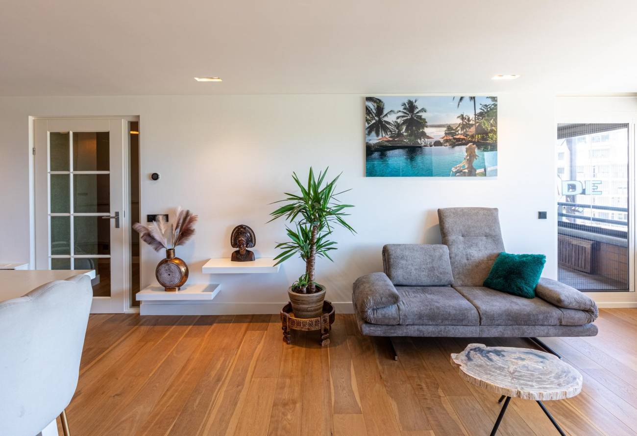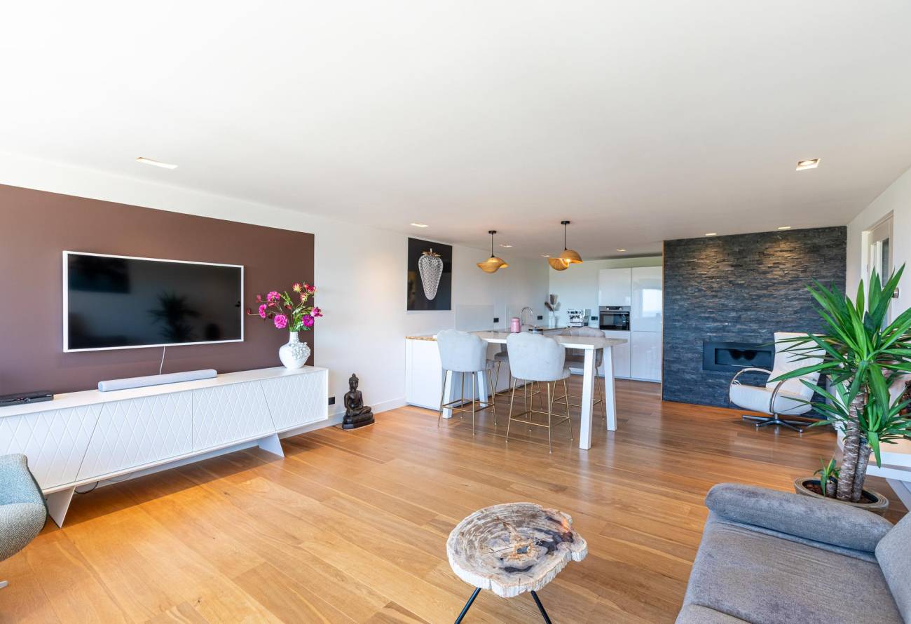 De lichtrijke woonkamer met balkon heeft een raampartij over de gehele breedte waardoor er een geweldig weids uitzicht is over de zee.