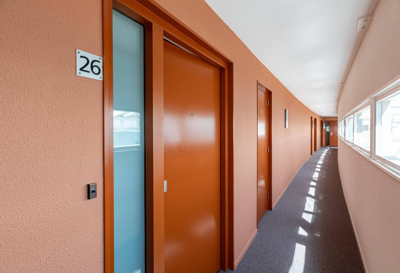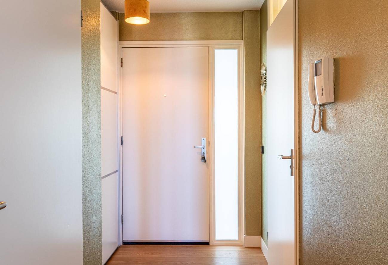 Entree via beveiligde centrale hal met video intercom, liftinstallatie en trappenhuis.