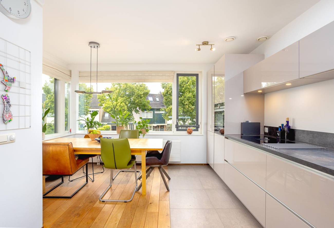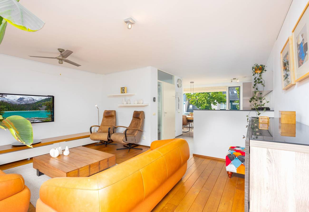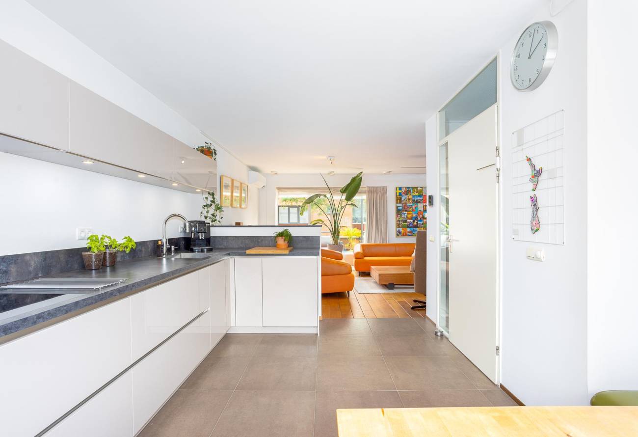 Op de eerste verdieping treft u de woonverdieping, met een moderne ruime keuken voorzien van verschillende inbouwapparatuur, waaronder een combi oven, koel-vriescombinatie (Liebherr Biofresch), inductie kookplaat (BORA), heet waterkraan (Quooker) en een vaatwasser. Aan het woongedeelte is het dakterras verbonden. In de keuken treft u een plavuizen vloer en in de woonkamer een houtenvloer. De ruimte is voorzien van airconditioning.