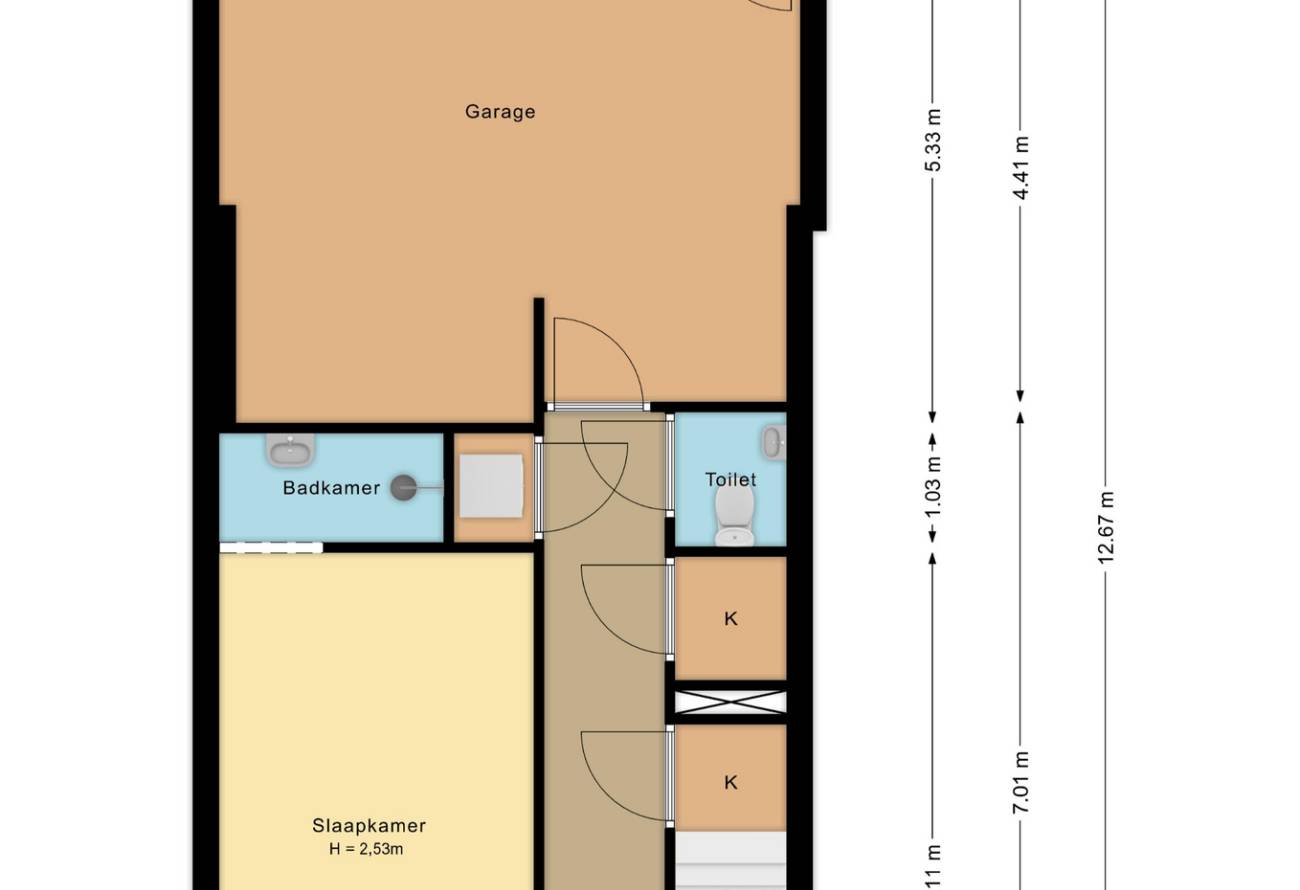 Op de begane grond van de woning vindt u een ruime kamer/ slaapkamer met airconditioning, en-suite badkamer (wastafel en douche), een inpandige zeer ruime garage, toilet, ruimte met aansluitingen voor was-apparatuur, technische ruimte, trap-/provisiekast en groepenkast (met 9 groepen + hoofdschakelaar).