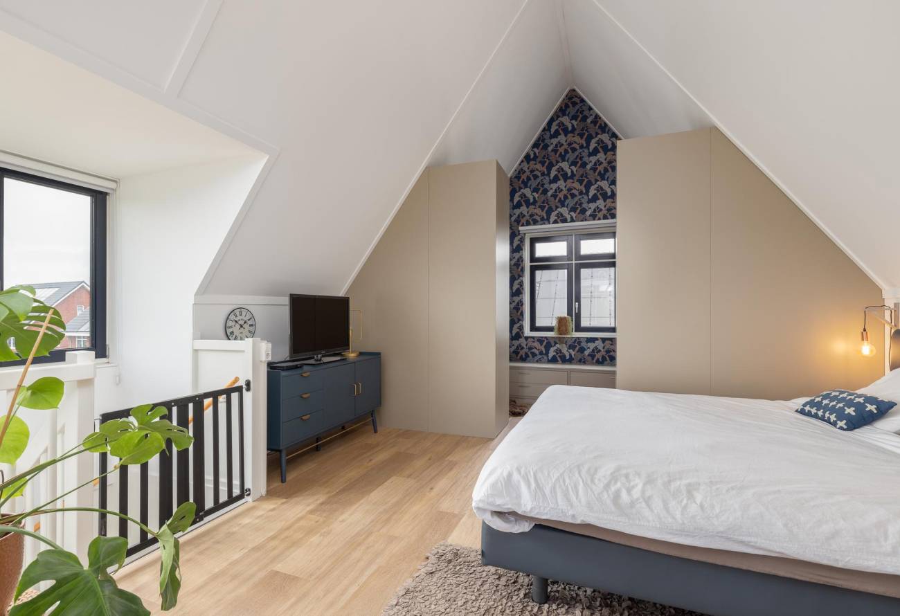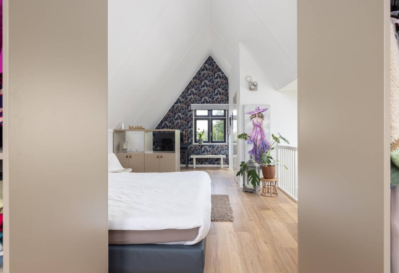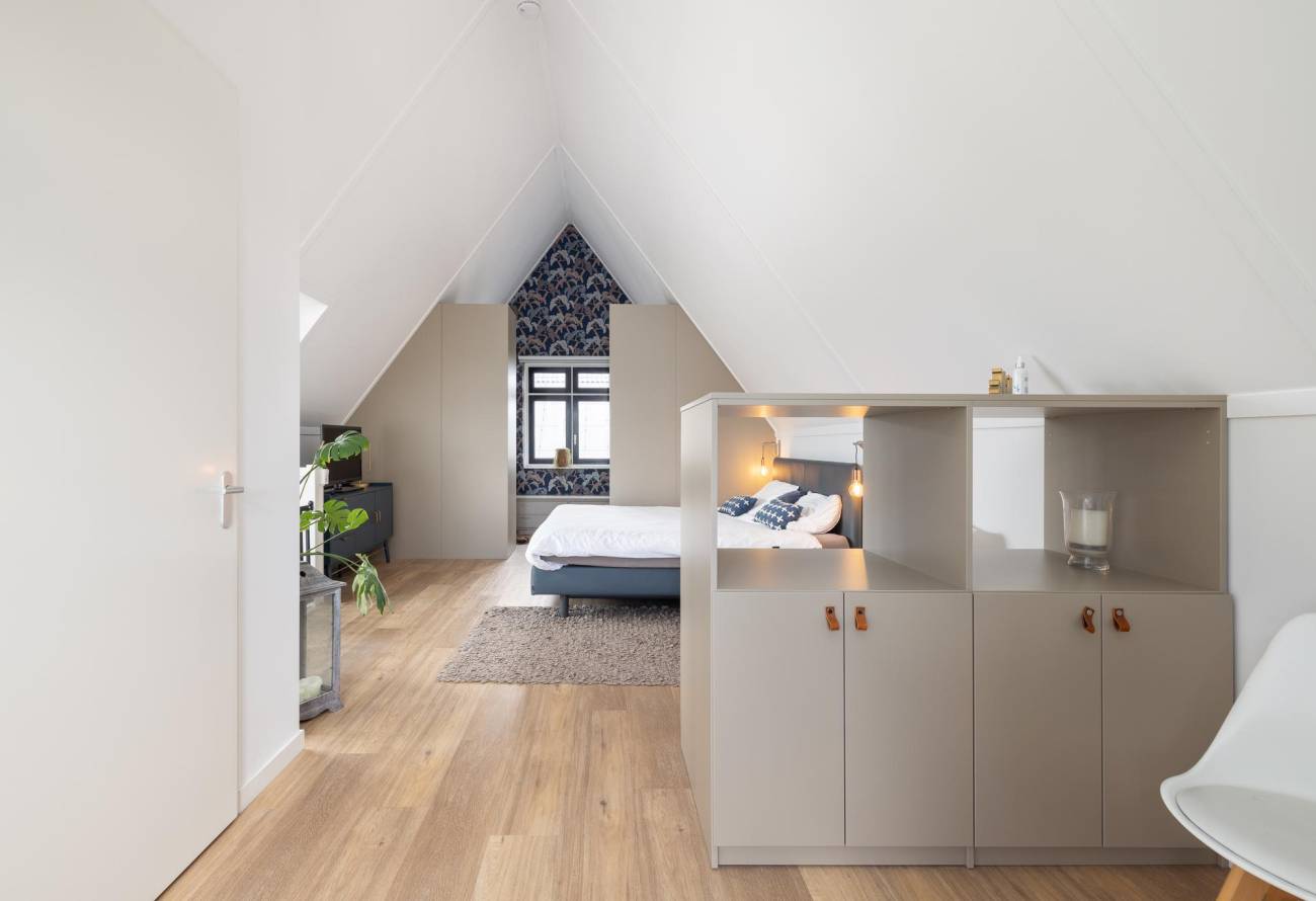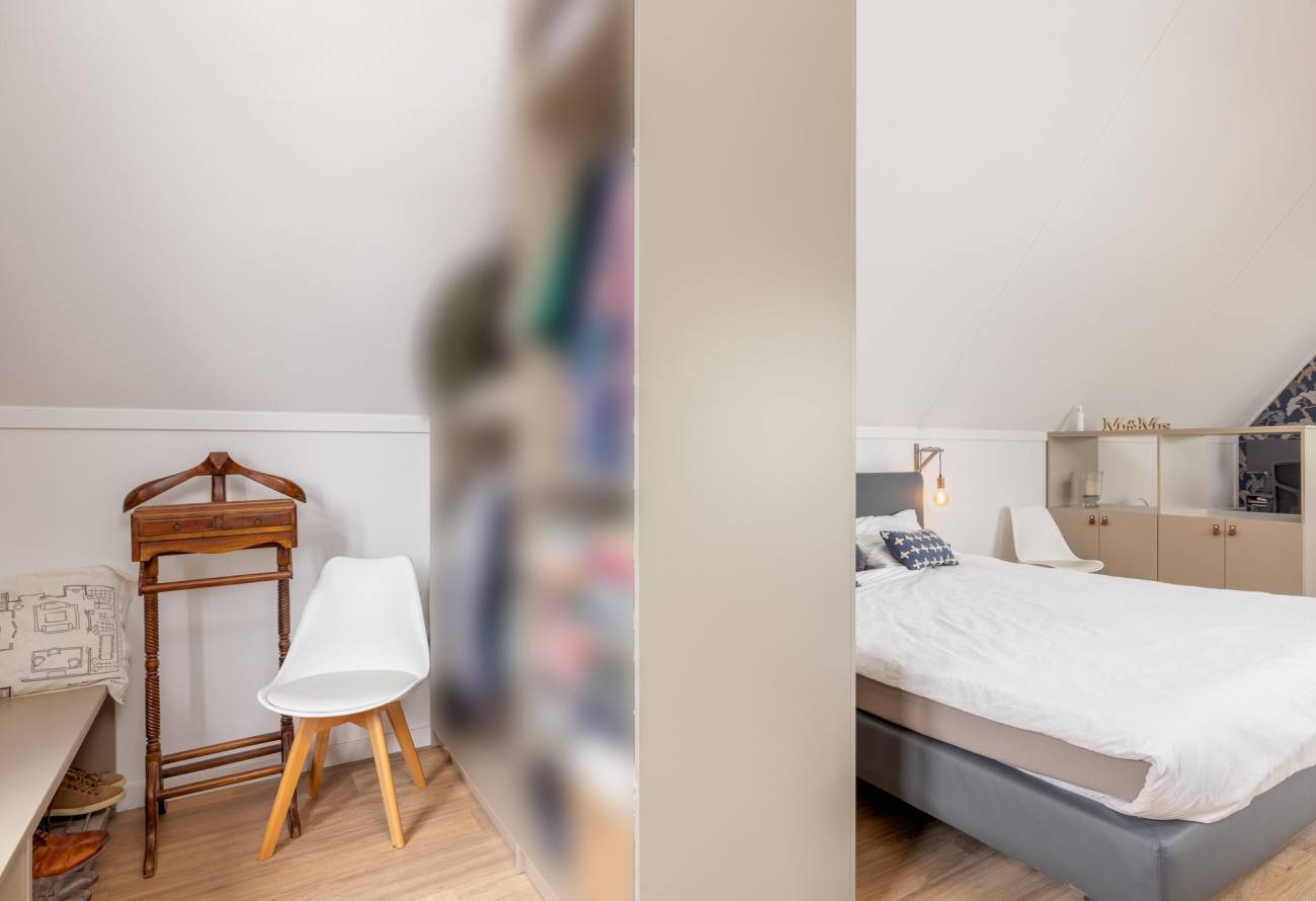 De tweede verdieping herbergt een grote vierde slaapkamer voorzien van maatwerk kledingkast en roomdivider; perfect als extra opslagruimte en als rustige werkplek. Tevens is hier een technische ruimte met de wasmachine aansluiting.