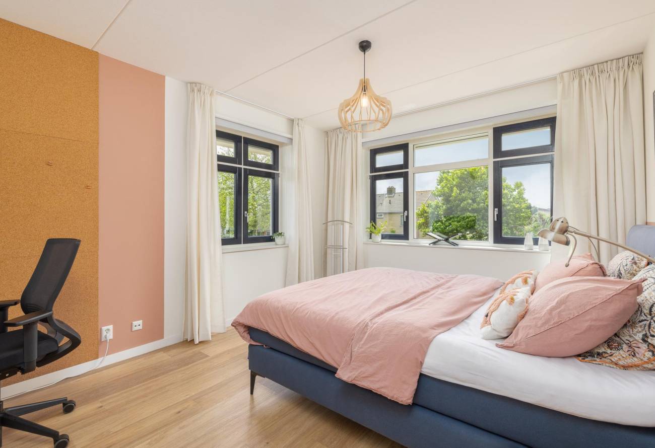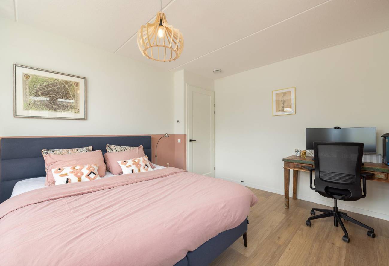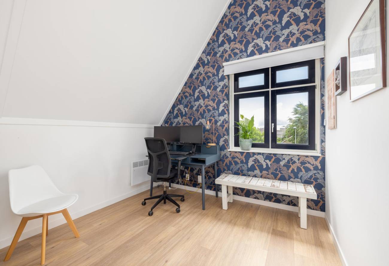 De tweede verdieping herbergt een grote vierde slaapkamer voorzien van maatwerk kledingkast en roomdivider; perfect als extra opslagruimte en als rustige werkplek. Tevens is hier een technische ruimte met de wasmachine aansluiting.
