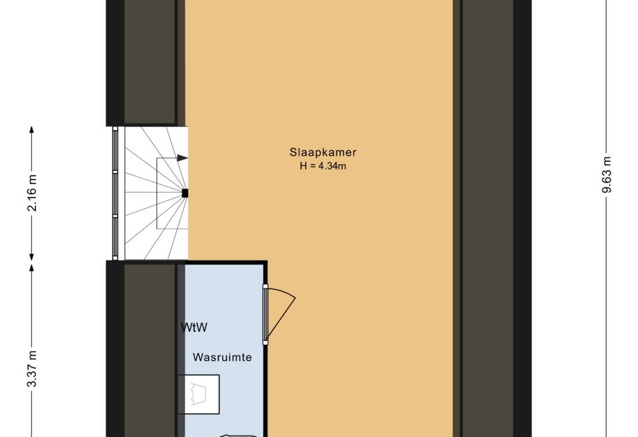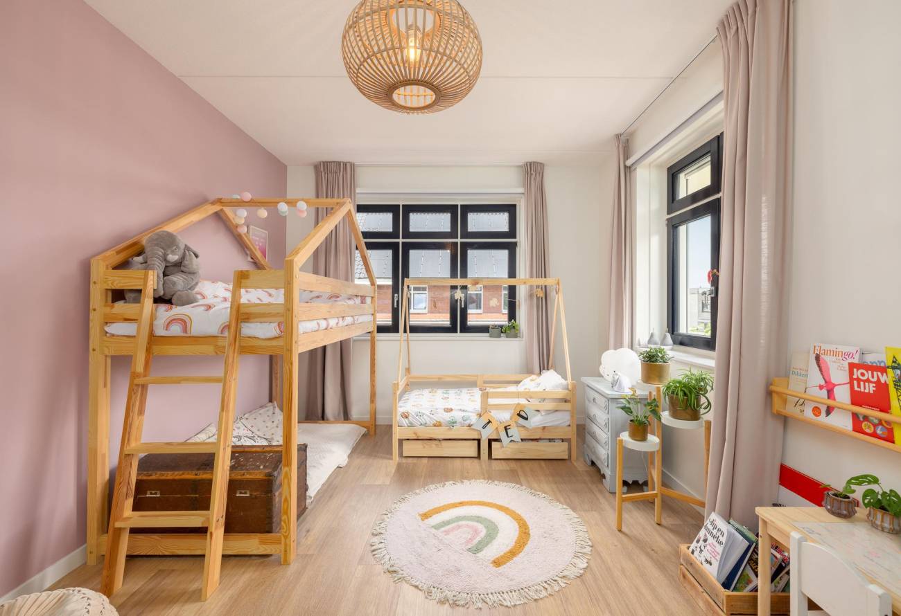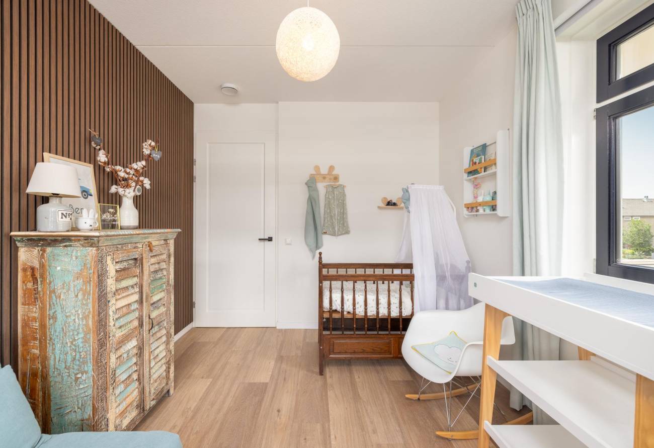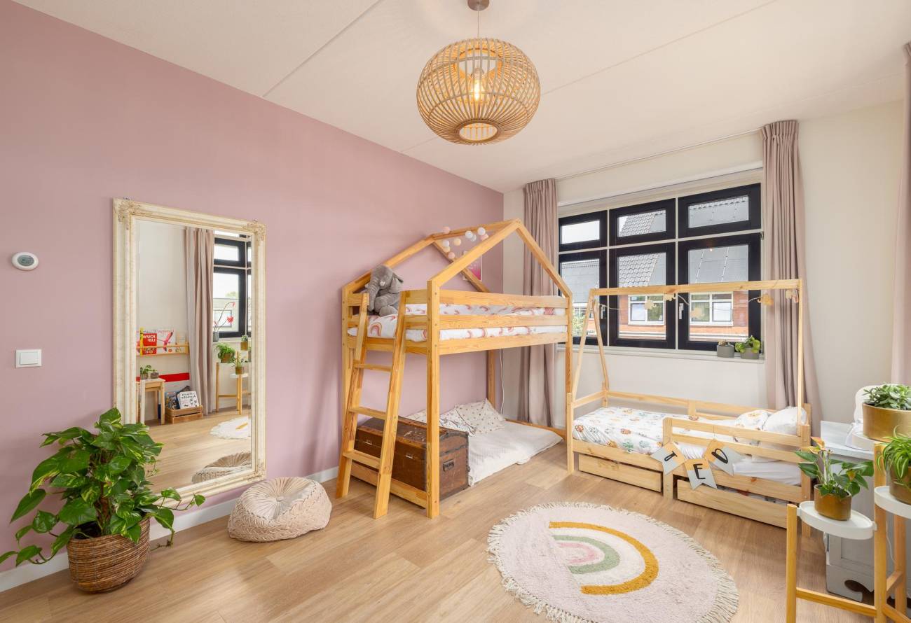 De tweede verdieping herbergt een grote vierde slaapkamer voorzien van maatwerk kledingkast en roomdivider; perfect als extra opslagruimte en als rustige werkplek. Tevens is hier een technische ruimte met de wasmachine aansluiting.