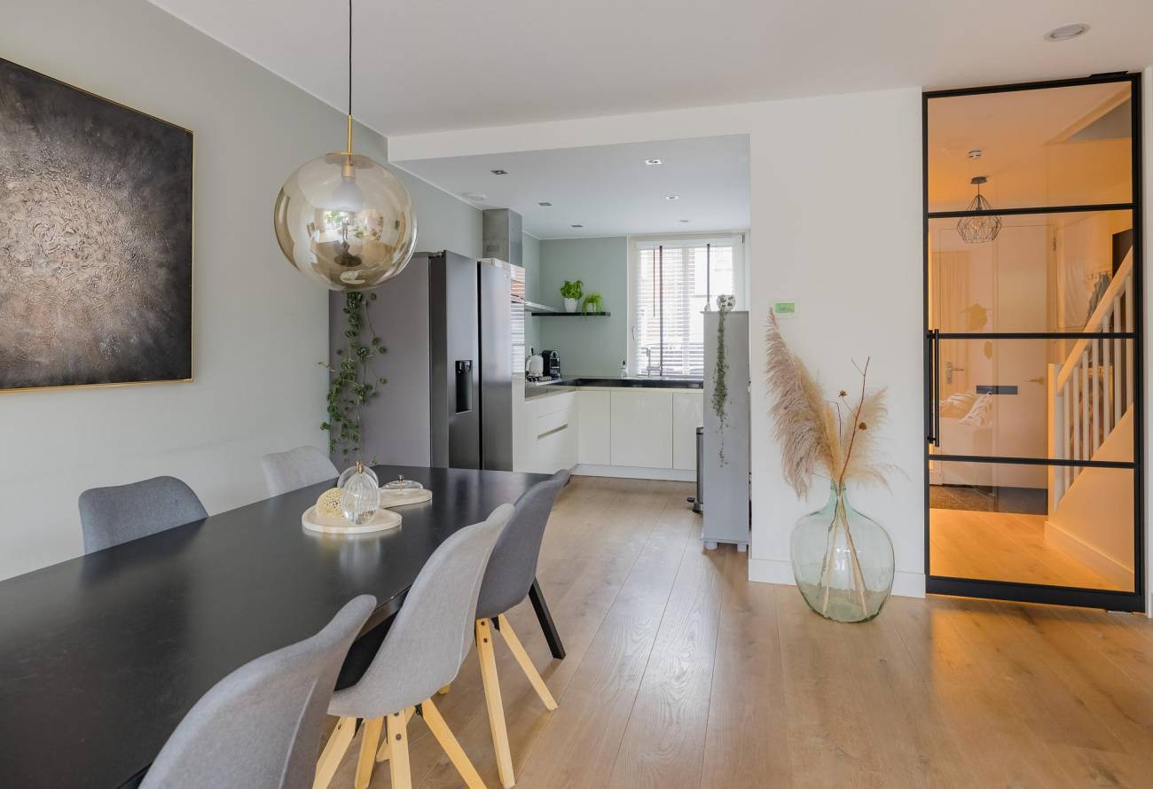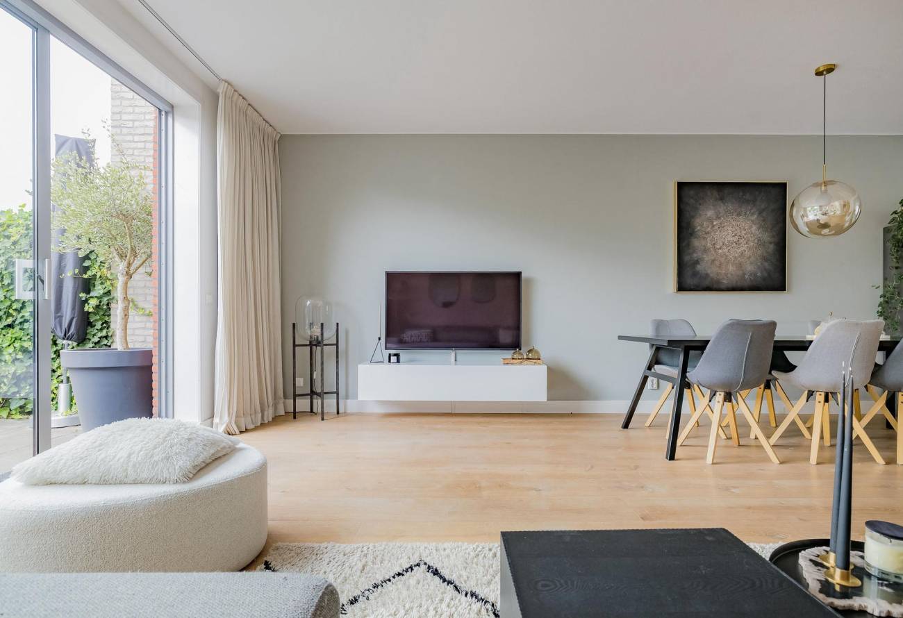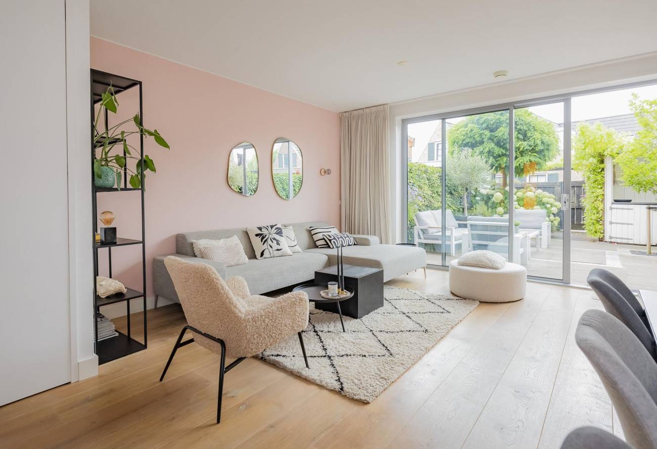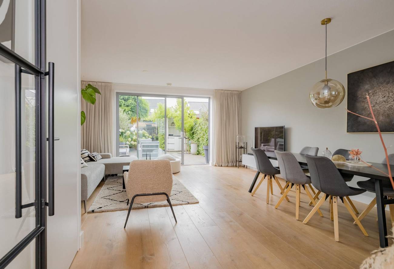 Je betreedt de woning via een nette hal met moderne stalen deur met glas naar de woonkamer – een detail dat direct een stijlvolle indruk maakt. De royale woonkamer is licht en ruim dankzij de grote schuifpui over vrijwel de volledige breedte van de achtergevel. Hierdoor stroomt het daglicht naar binnen en loopt de woonkamer naadloos over in de zonnige tuin.