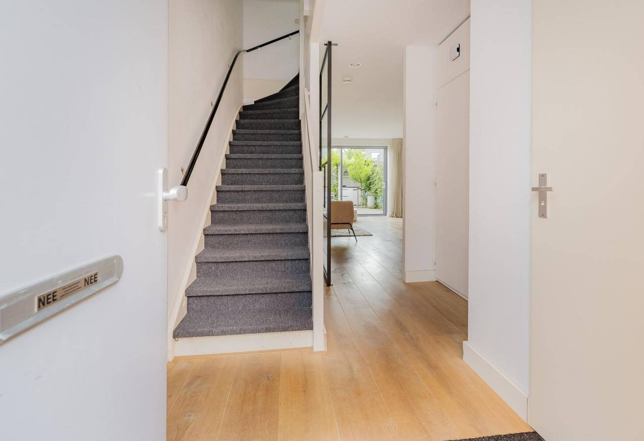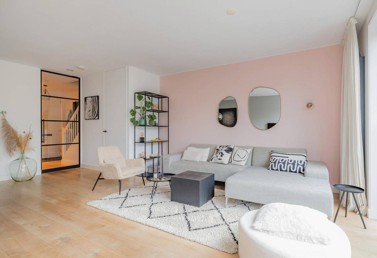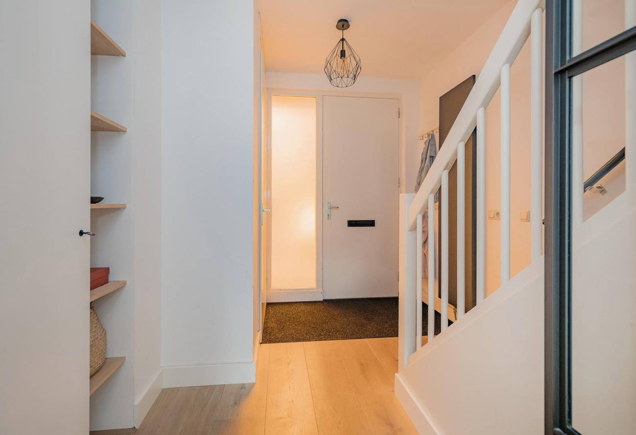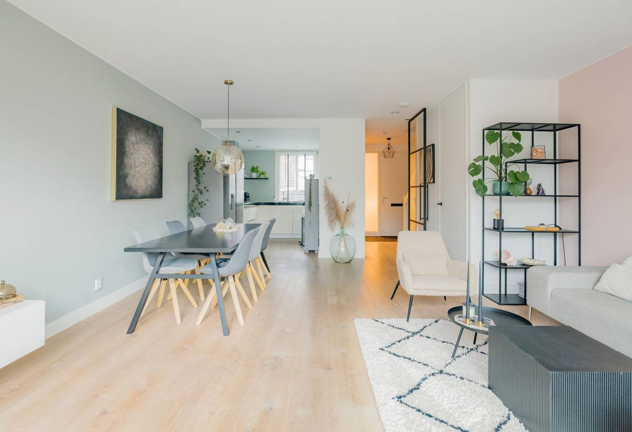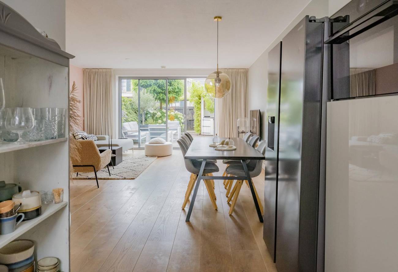 Je betreedt de woning via een nette hal met moderne stalen deur met glas naar de woonkamer – een detail dat direct een stijlvolle indruk maakt. De royale woonkamer is licht en ruim dankzij de grote schuifpui over vrijwel de volledige breedte van de achtergevel. Hierdoor stroomt het daglicht naar binnen en loopt de woonkamer naadloos over in de zonnige tuin.