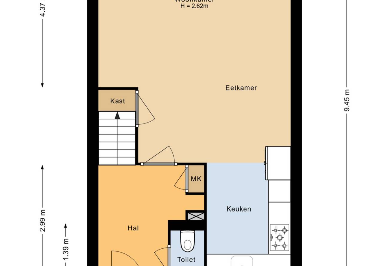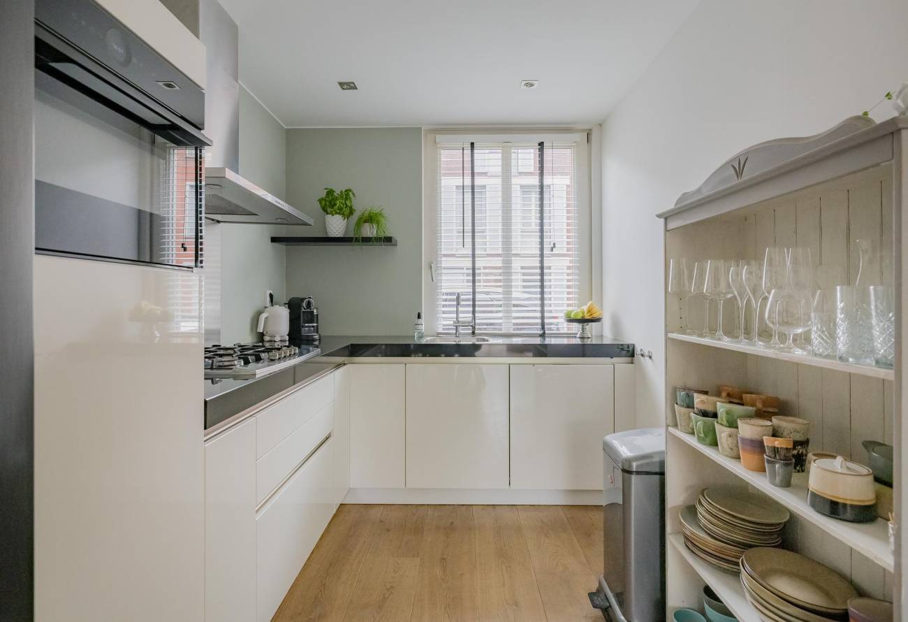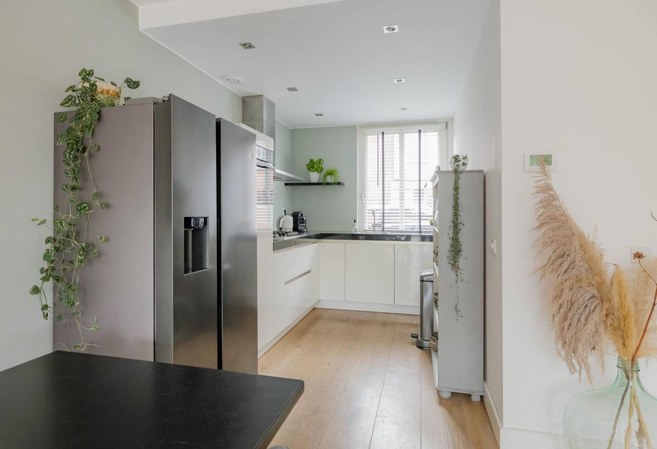 De houten vloer in grey wash eiken geeft warmte en karakter aan de ruimte. De open hoekkeuken aan de voorzijde is verzorgd en compleet uitgerust met een combi-oven/magnetron, vaatwasser en losstaande koelkast. Daarnaast biedt een trapkast handige extra bergruimte.