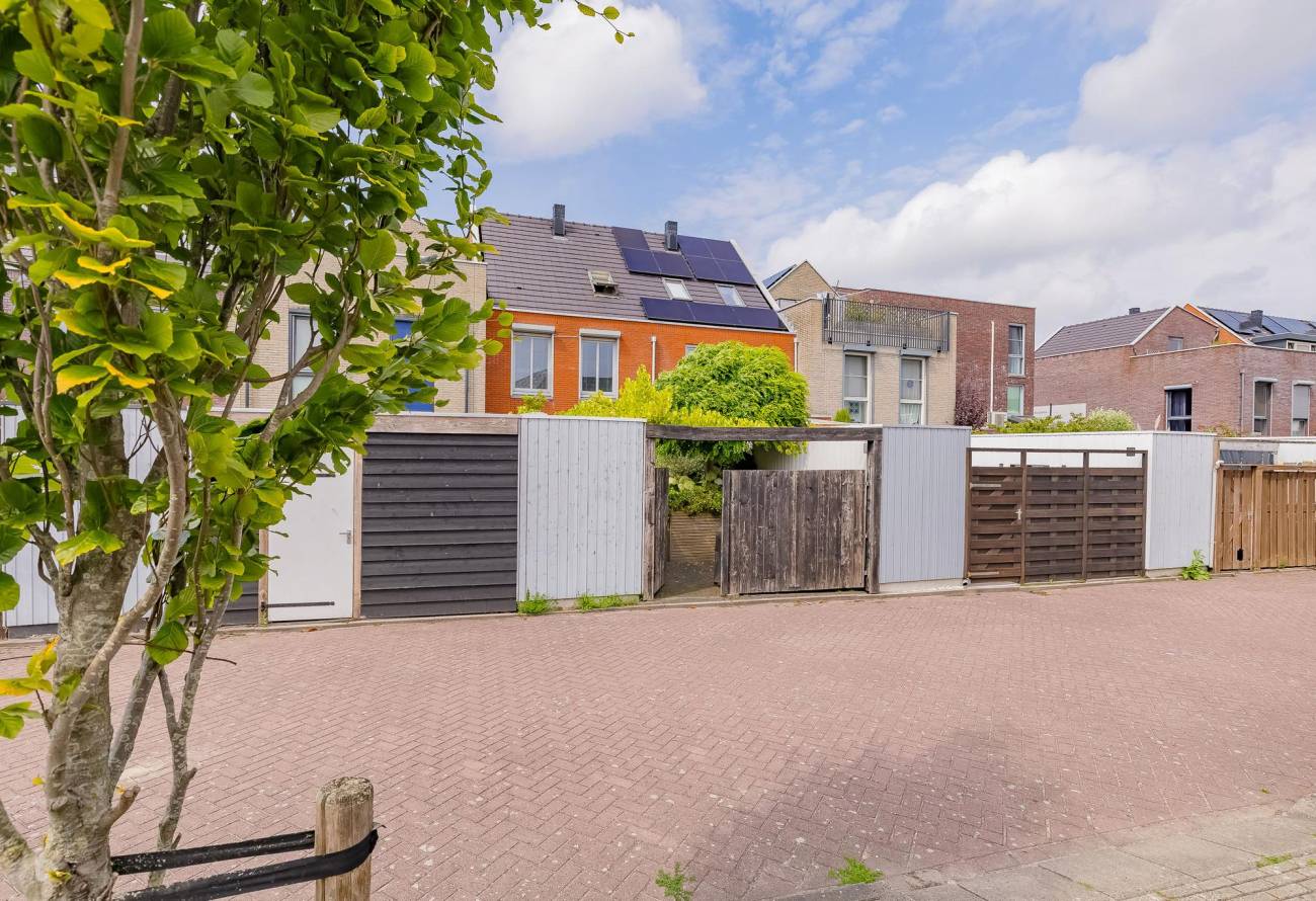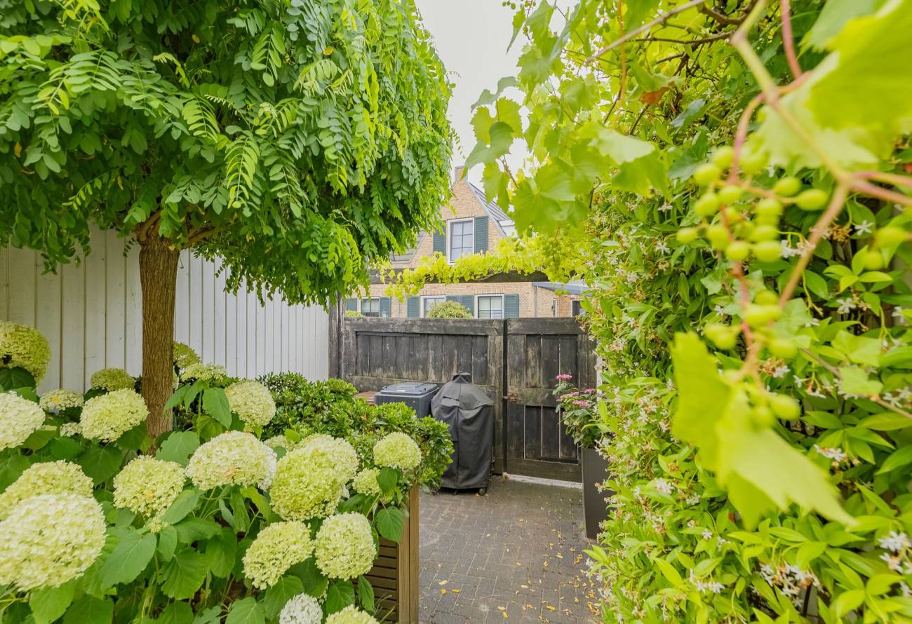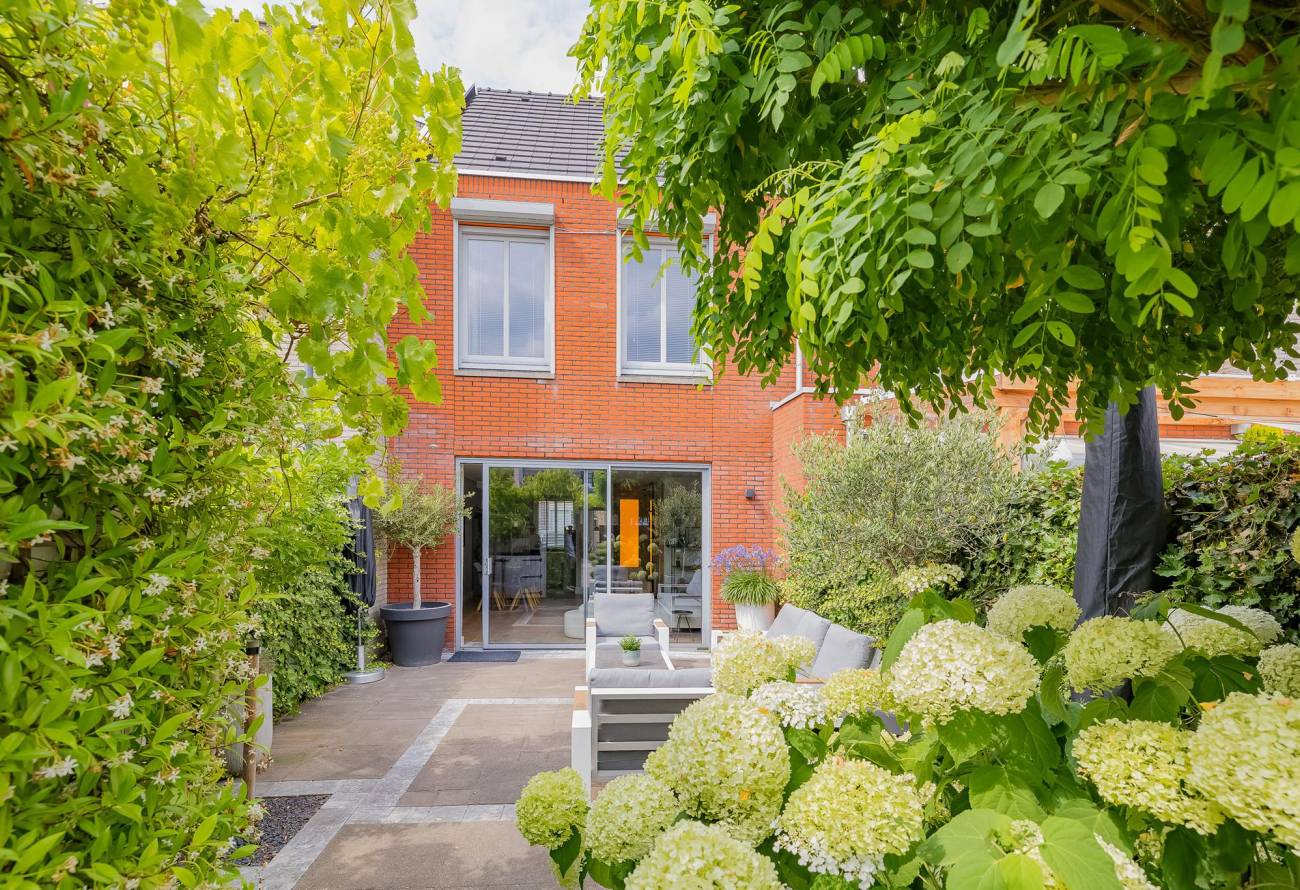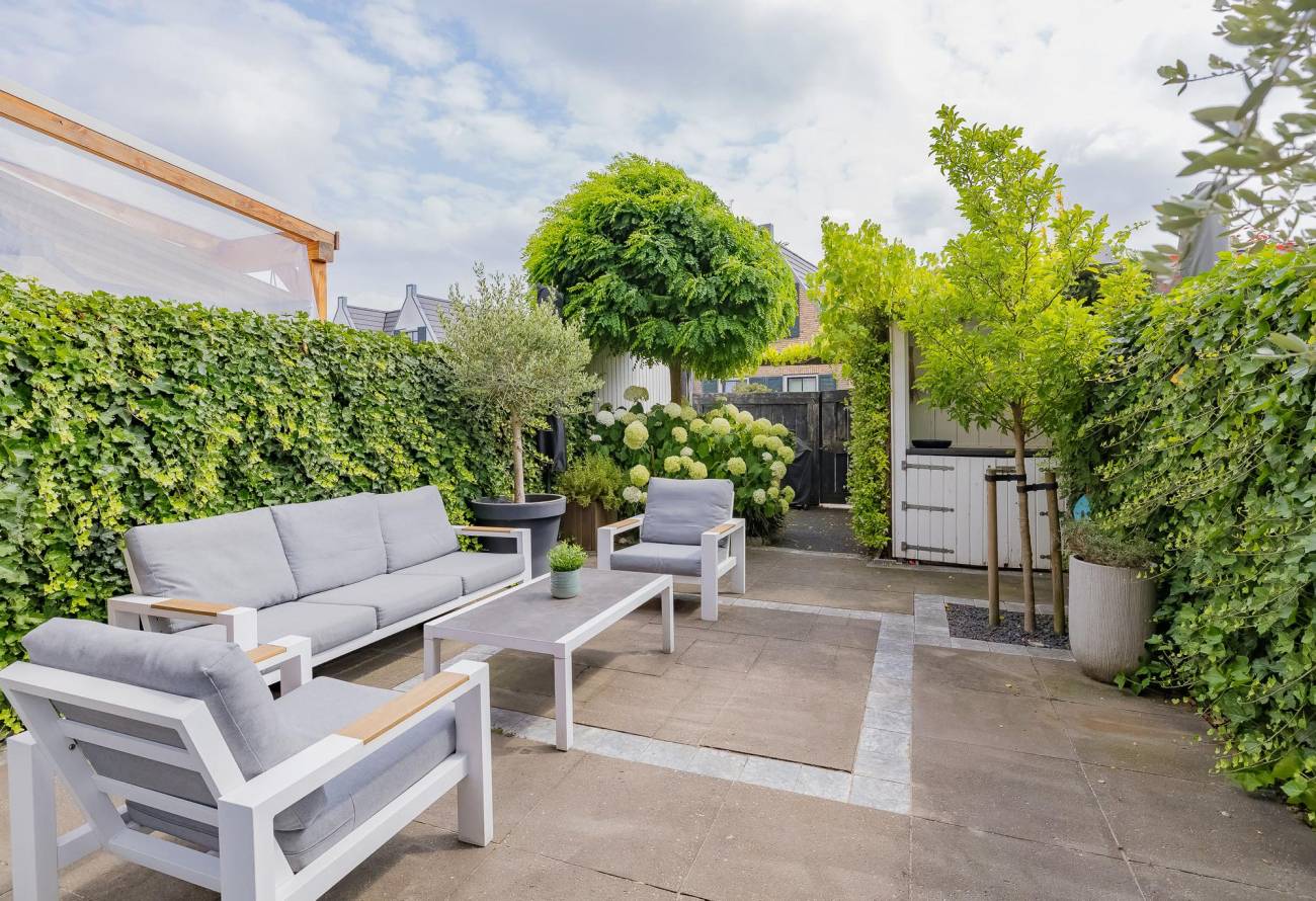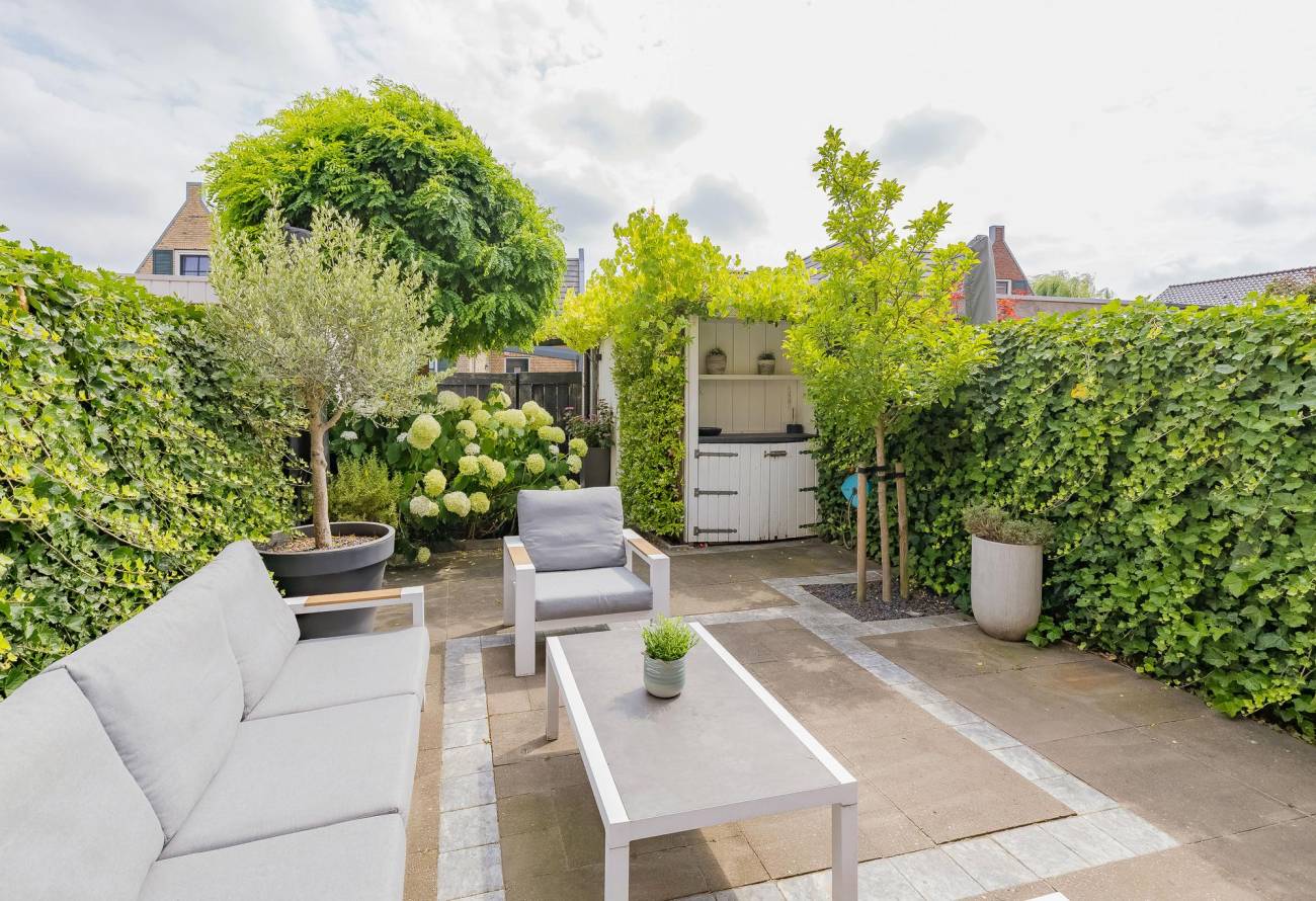 De zuidgerichte achtertuin is een ware blikvanger: fraai aangelegd met bloeiende Annabelles, een zonnig terras en zonwering aan de gevel. Alles met oog voor sfeer én onderhoudsgemak. Achter in de tuin vindt je een ruime houten berging voor fietsen en gereedschap, evenals een net afgescheiden plek voor containers en fietsen – praktisch en strak weggewerkt.