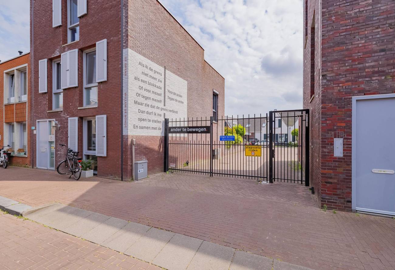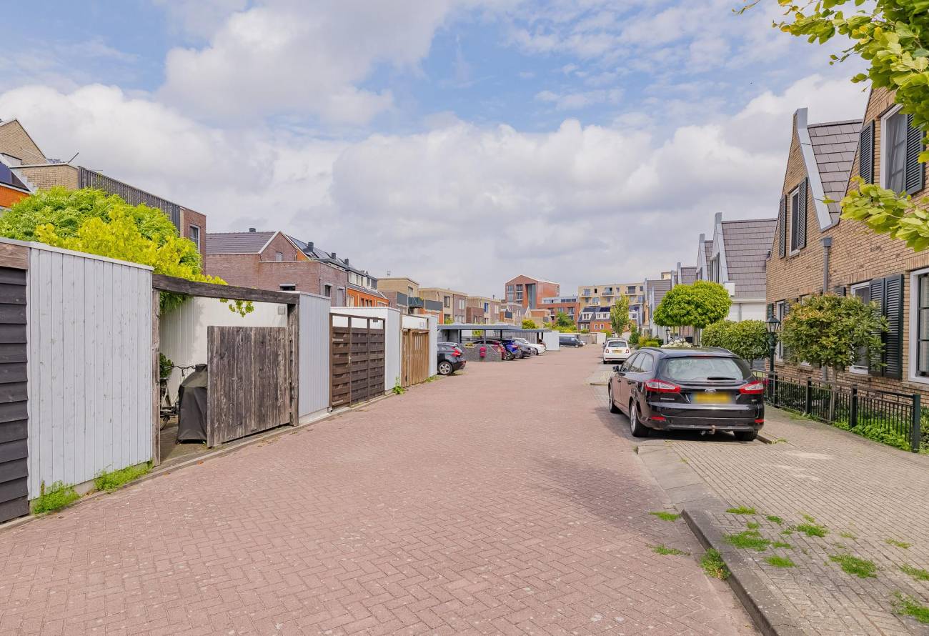 De straat waar de tuin aan grenst is geen doorgaande weg, maar een gedeeld eigendom (mandeligheid) in een VVE met kosten per kwartaal van € 36,-. Hier kunnen de kinderen veilig spelen. Het terrein is afgeschermd met een hek dat alleen door de bewoners geopend kan worden via een sleutel of afstandsbediening.