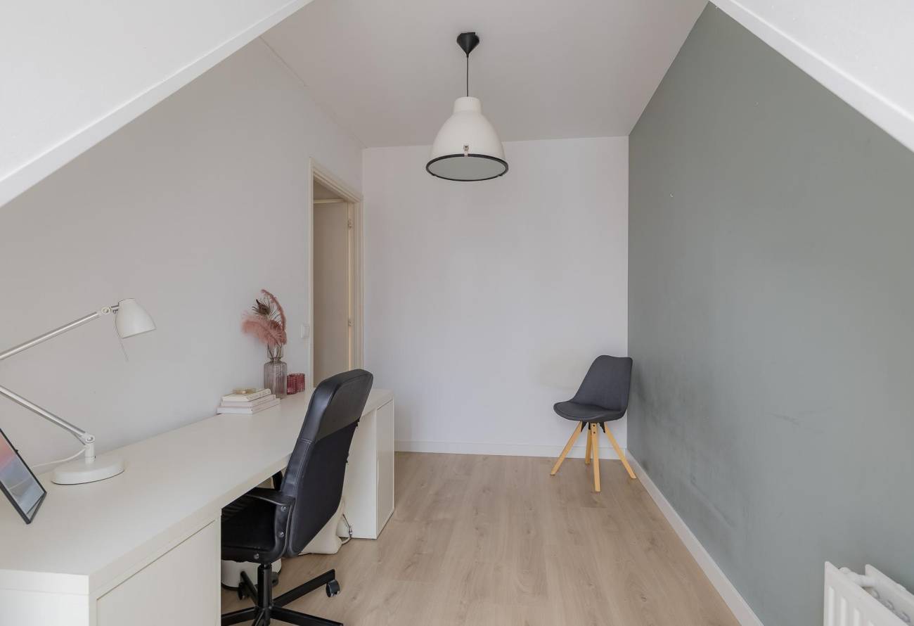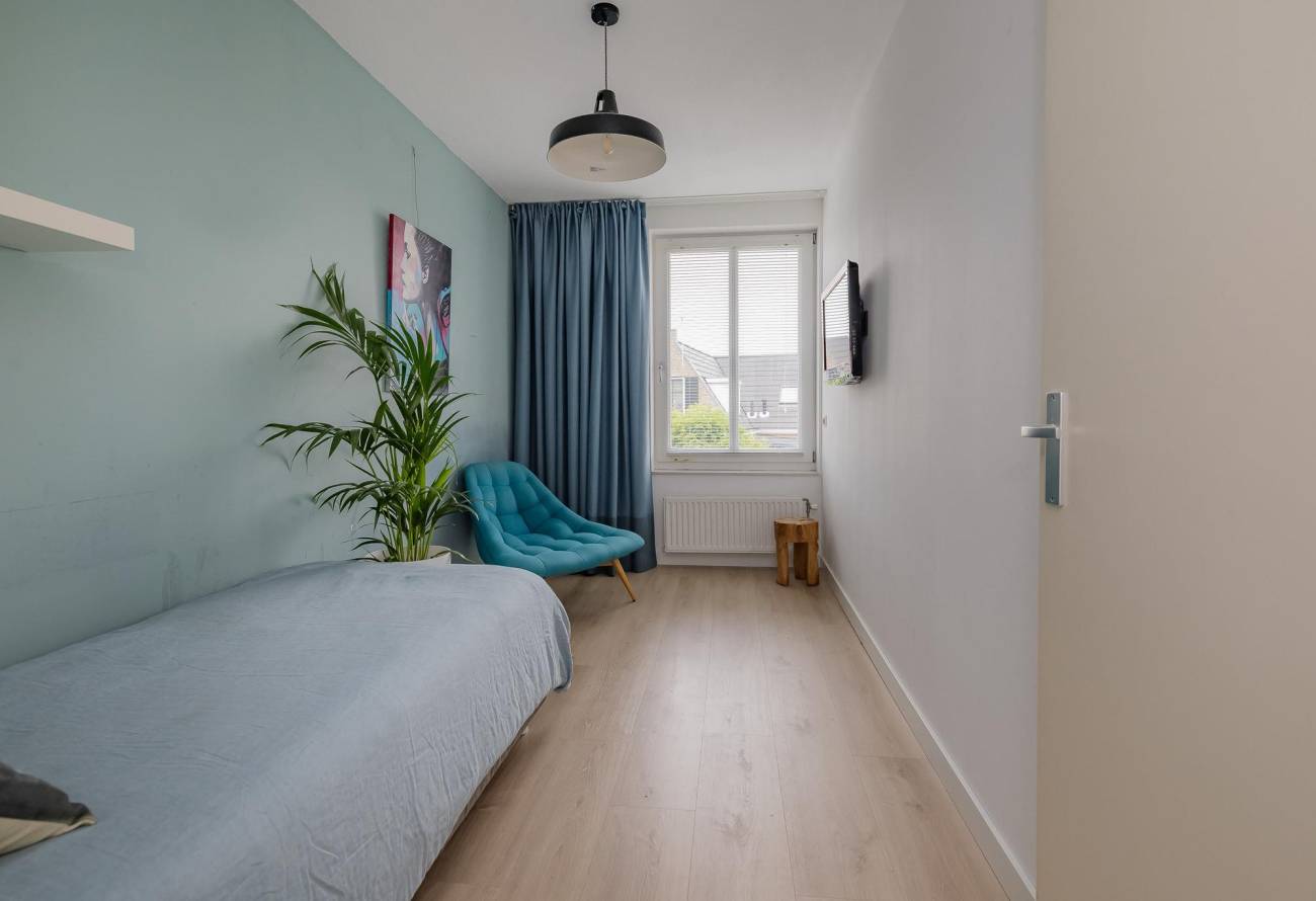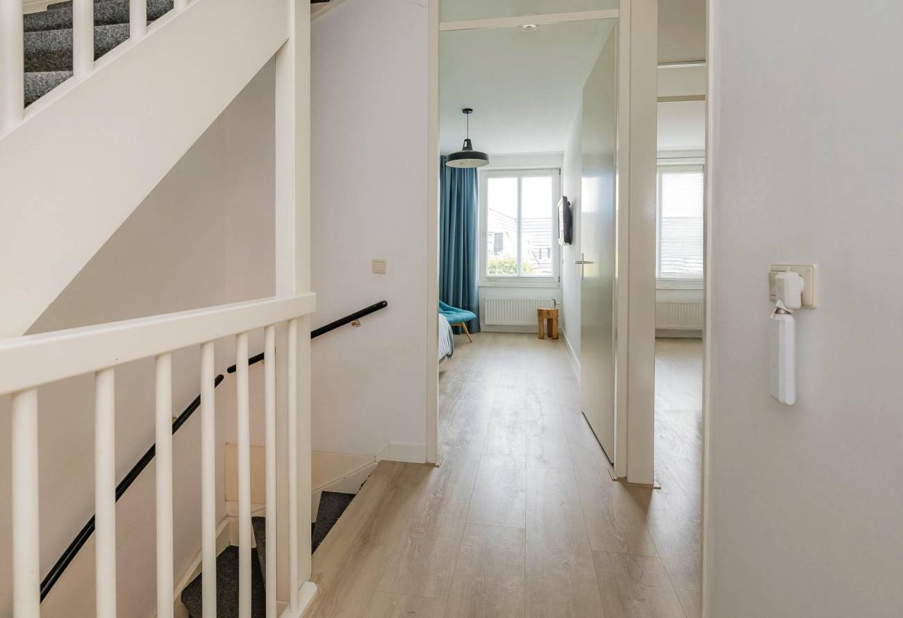 Op de eerste etage tref je drie slaapkamers, waarvan één met een royale inloopkast. De moderne badkamer is uitgerust met een inloopdouche, tweede toilet en een stijlvol badkamermeubel. De hele verdieping is voorzien van een strakke laminaatvloer. De slaapkamers aan de zuidkant houdt je lekker koel door de rolluiken.