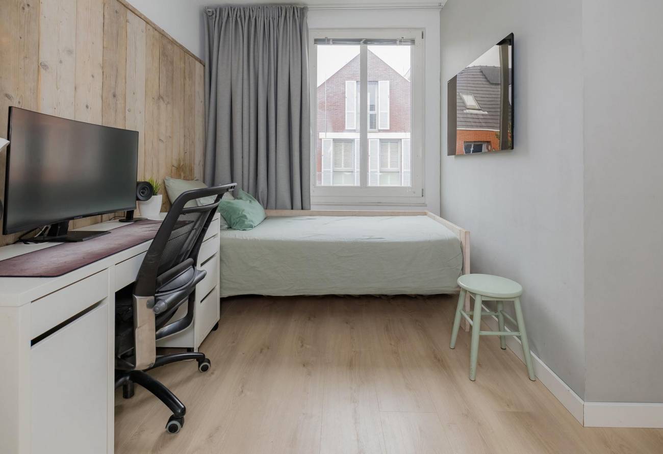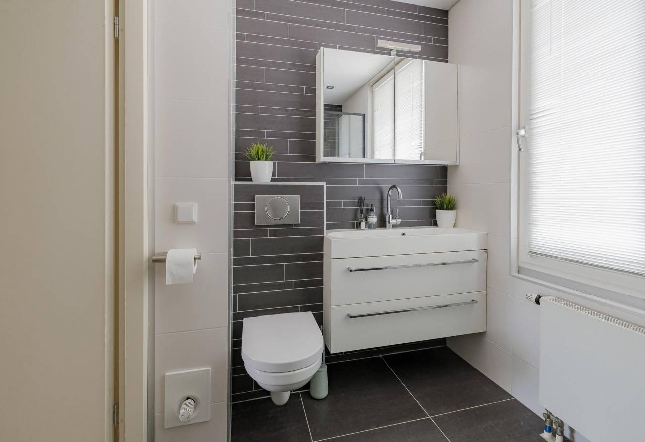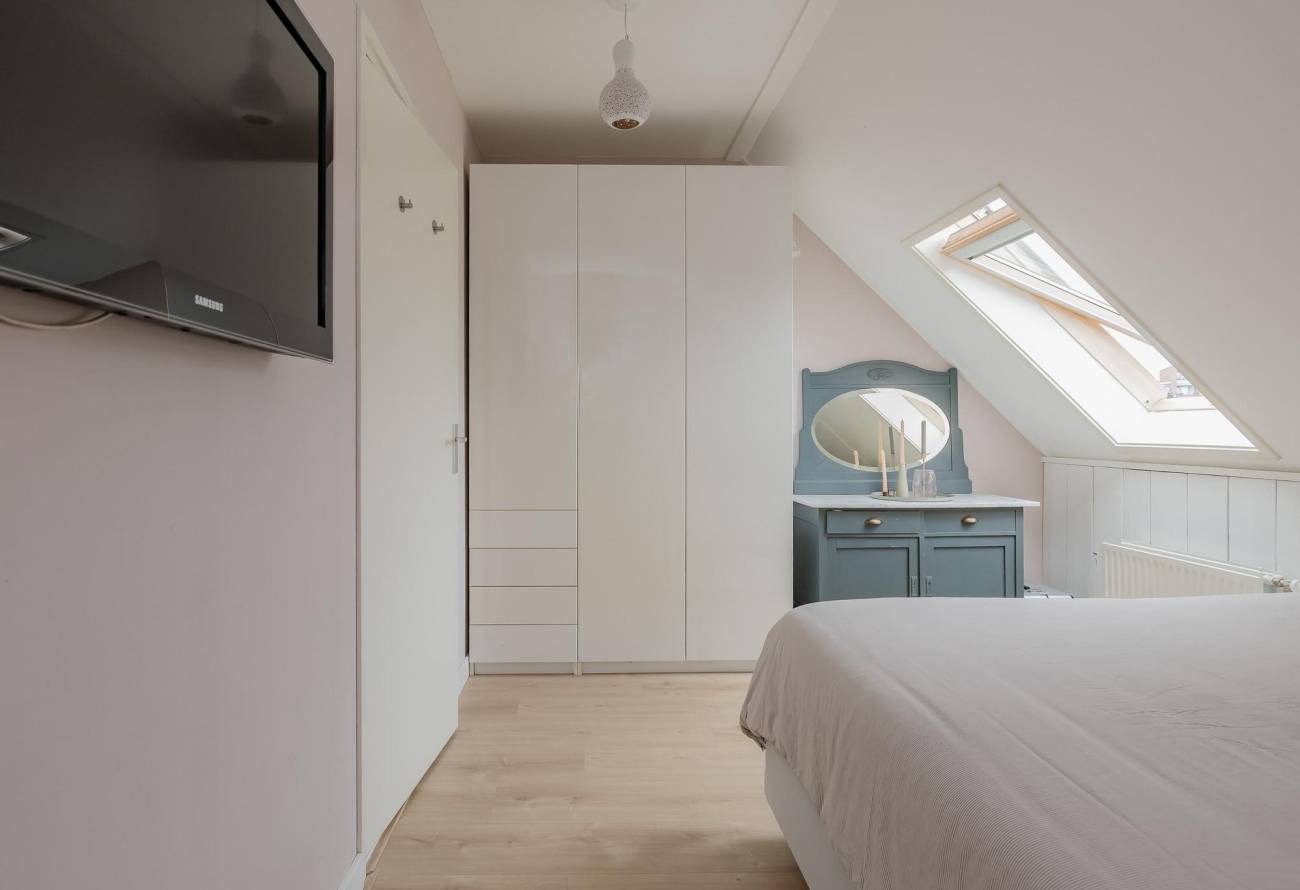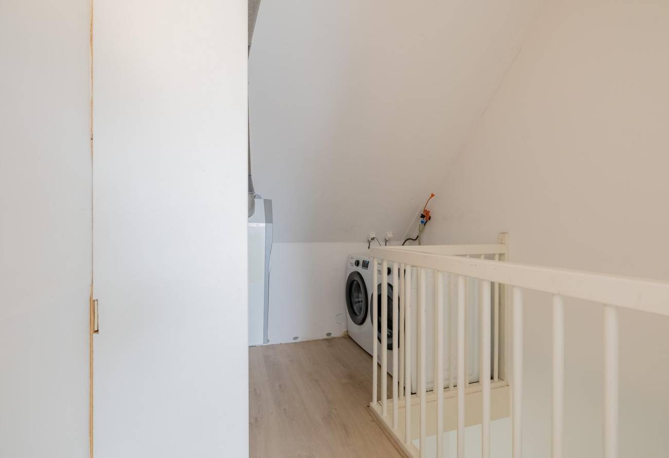 De bovenste verdieping biedt nog eens twee slaapkamers en een ruime overloop met de opstelplaats voor de wasmachine, droger en de cv-ketel. Ook hier ligt een nette laminaatvloer.